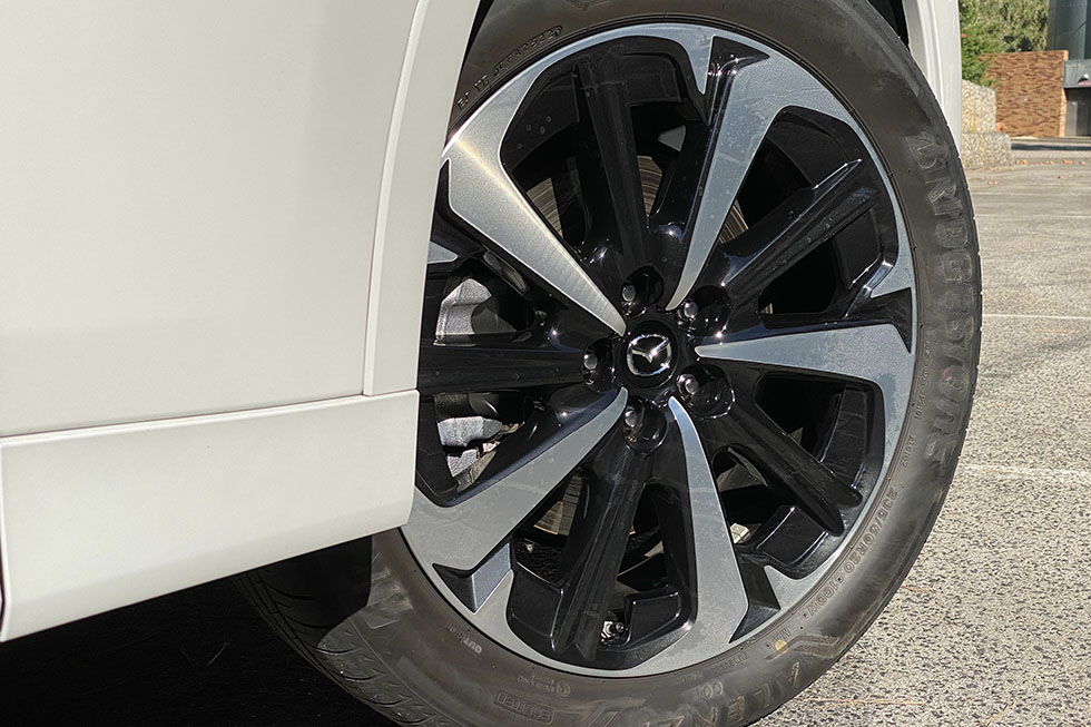 Outra primeira impressão que registamos neste primeiro contacto com o CX-60 está relacionada com as suas dimensões, uma vez que a imponente grelha dianteira e os 1,7 metros de altura nos transmitem a ideia de que se trata de um SUV gigante. Mas depois, os 4,75 metros de comprimento e os 1,89 de largura, nem são nada no outro mundo, o que também acabamos por perceber quando circulamos em cidade. No caso da unidade ensaiada, as estreias passam também pela cor escolhida que é o novo Rhodium White escolhido para a apresentação deste modelo. E para complementar o conjunto, esta versão Takumi está também equipada com um conjunto de jantes de liga leve com 20 polegadas de diâmetro.