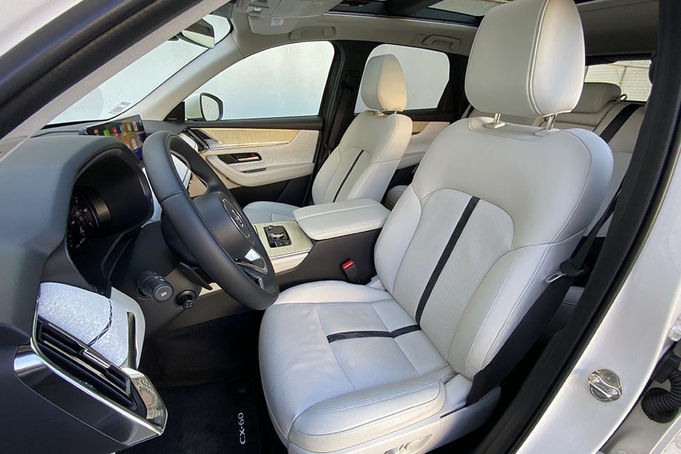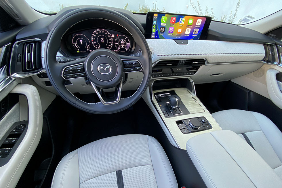 A nova imagem da Mazda para os seus modelos é também registada a bordo do CX-60. Mais uma vez, há elementos que conhecemos de outros modelos da marca, mas todo o ambiente parece ter evoluído e passado a Mazda para uma nova era. Todo o ambiente mais claro desta versão Takumi e a presença de um teto de abrir panorâmico, oferecem uma maior iluminação ao habitáculo, perfeita para percebermos a escolha de novos materiais no tablier e de um desenho que se tenta prolongar pelos painéis das portas, aumentando a sensação de largura do habitáculo.