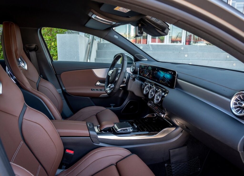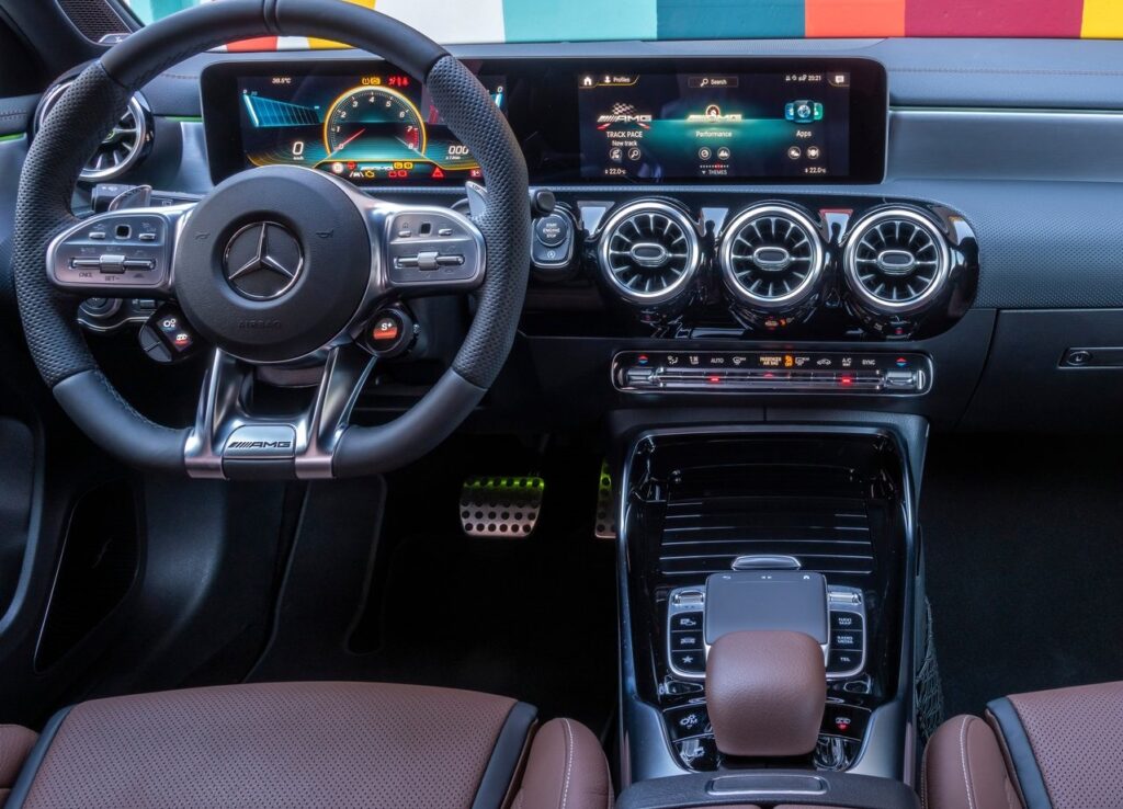 Se há carros complexos, este AMG A45S é um deles! Basta olhar para o painel de instrumentos, feito com um enorme ecrã a cores de alta definição e para o ecrã ao lado, para o sistema de info entretenimento. E, quer se queira, quer não, a Mercedes acertou em cheio: simplicidade (os dois ecrãs estão incluídos num enorme tablet que resiste ao sol, á sombra, enfim, excelente) e integração perfeita num interior que destaca as saídas do ar da climatização do mais belo efeito. O reverso da medalha é o excesso de informação e o facto de exigir algum tempo de habituação. Tudo está nestes dois ecrãs e regular tudo e mais alguma coisa leva tempo: falamos do computador de bordo, o sistema de navegação com dezenas de opções, os modos de condução (no A45 S são cinco), a configuração individualizada de vários parâmetros e, ainda, configurar a “TrackPace”, uma aplicação que lhe dá todas as informações sobre a condução. Depois pode alterar a cor dos ecrãs, os estilos das imagens que transmitem, enfim, tanta coisa que são precisas algumas horas para configurar tudo. Depois, tudo isto é controlado através de um “touch pad” que é mais irritante que funcional e pelos pequenos “touch pad” colocados no volante, que são ainda mais complicados de utilizar. Tirando isto, o interior está muito bem construído, os bancos são excelentes e a posição de condução perfeita. E quando andamos a “brincar” com as capacidades do carro, os bancos mostram toda a sua qualidade a suportarem o corpo. Há espaço interior mais que suficiente para quatro pessoas, o conforto é o possível num carro desportivo e a bagageira com 370 litros que podem chegar aos 1210 litros com as costas do banco rebatido.