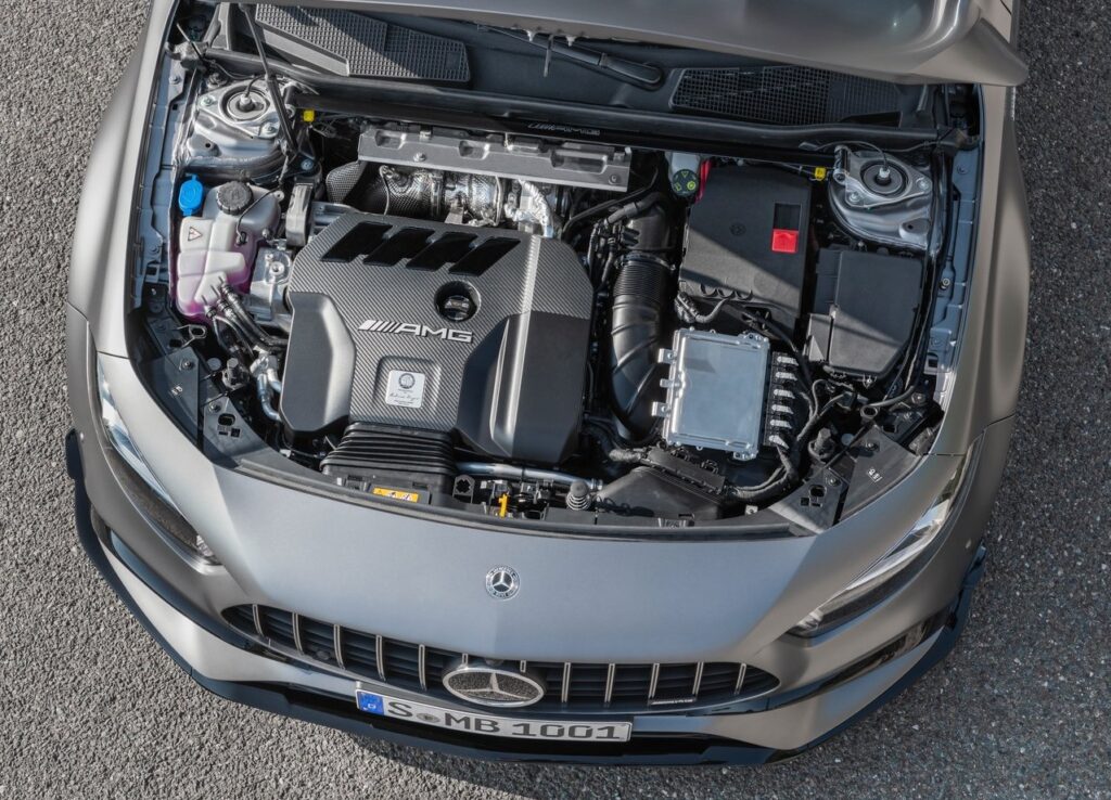 O bloco de 2.0 litros sobrealimentado pode parecer ser o mesmo do anterior A45, mas a AMG fez uma intervenção profunda e, no final, terão ficado um par de parafusos iguais… O facto de ter apenas dois litros, fez a AMG – que constrói o bloco em Affalterbach na mesma zona onde foram construídos os motores V12 dos Maybach e os V12 usados pela Pagani! – ter de puxar por tudo e mais alguma para oferecer 421 CV e 500 Nm! Sim, leu bem: 421 CV e 500 Nm de binário. Está inclinado 180 graus para trás, pelo que a admissão é feita pela frente enquanto o coletor de escape e o turbo estão na parte posterior. Para refrigerar bem o bloco e o turbo, a AMG decidiu refrigerar o turbo com líquido, óleo e ar, sendo que neste caso há uma tomada de ar na frente que canaliza o ar por baixo da cobertura do motor, passa pelo turbo e pelo escape e sai num buraco propositado no fundo do carro. Para refrigerar tudo e mais alguma coisa, há três bombas de água e dois reservatórios: duas elétricas para o bloco do motor e para o intercooler e uma mecânica para a cabeça do motor. Uma bomba que tem capacidade de bombar 280 litros de água por minuto, exatamente o dobro do que acontece normalmente. O intercooler tem um arrefecimento que arrefece dos 200 para os 50 graus e quando isso não acontece, o sistema pede ajuda ao ar condicionado. O anterior motor tinha o pico de binário logo às 2250 rpm e ficava num patamar mais ou menos plano até às 5000 rpm. Agora, esse pico é as 5000 rpm, mas há muito binário logo desde o início, beneficiando a utilização a médias rotações. A caixa de dupla embraiagem é excelente e assegura passagens de caixa velozes que no modo Race vêm acompanhados de muitos “pow, pow”…