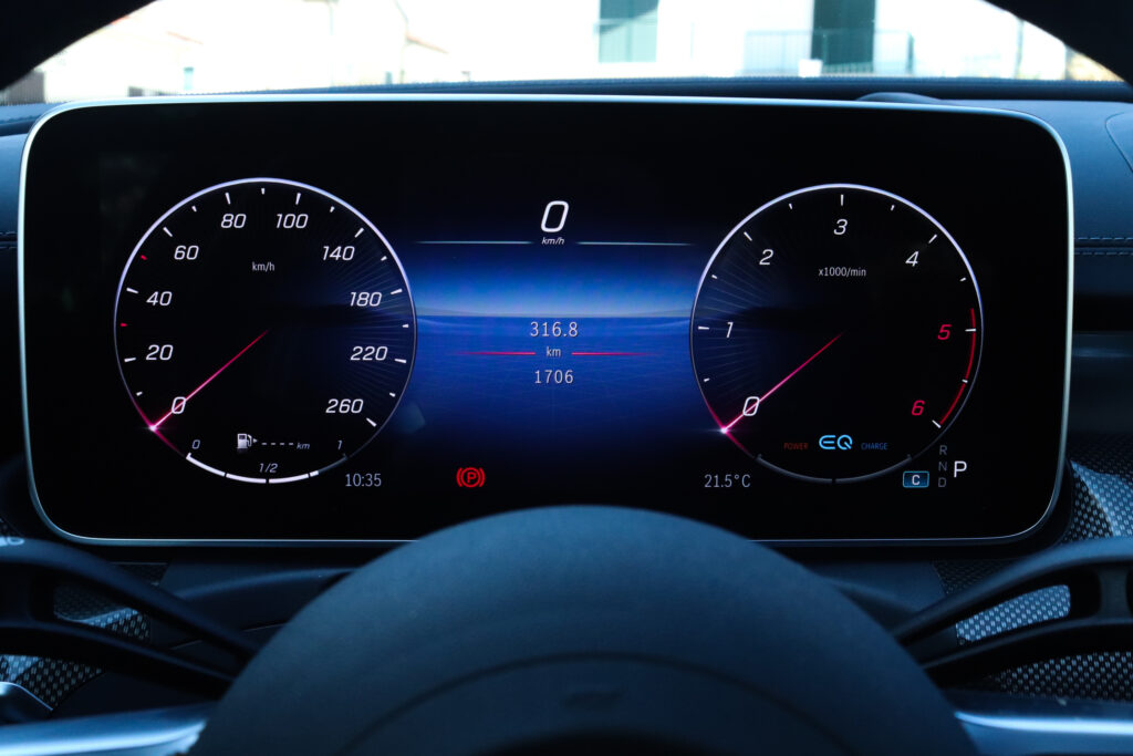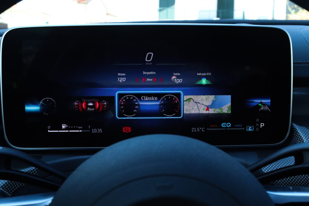 Interior (9/10) Se por fora é uma evolução, no interior é mesmo uma revolução. O principal ponto forte é a adoção de um design semelhante ao do Classe S, ou seja, o painel de instrumentos digital é agora separado do ecrã central, ecrã esse que passa a estar disposto na vertical. Para além disso adota novas saídas de ventilação ligeiramente mais achatadas e o mais recente volante multifunções da marca que, na nossa opinião, está muito bem conseguido. Como seria de esperar da Mercedes, tanto os materiais como a construção são praticamente irrepreensíveis.