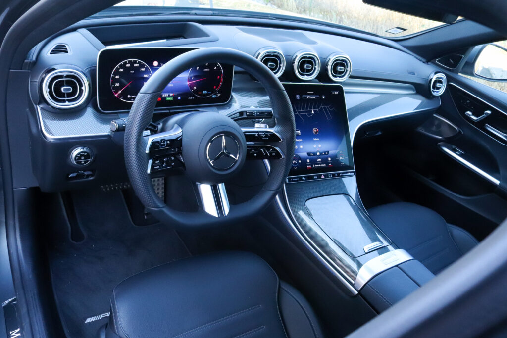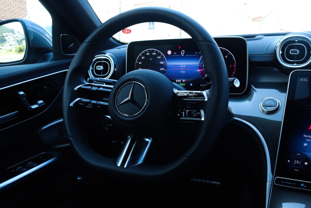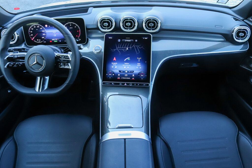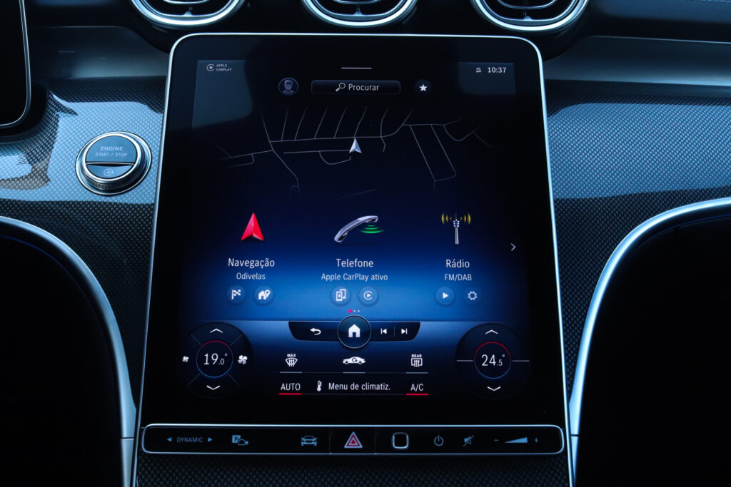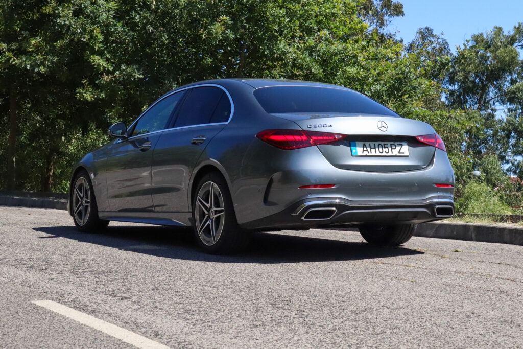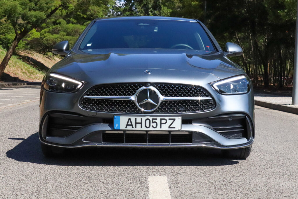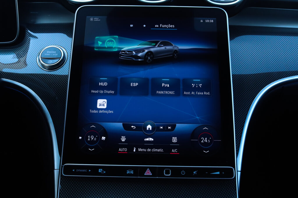 Equipamento (8/10) Como é comum no segmento D premium, o novo Mercedes-Benz Classe C tem um bom recheio. É caso de isso o sistema de infotainment MBUX, painel de instrumentos digital de 12,3 polegadas, ecrã central de 11,9 polegadas, assistente ativo de faixa de rodagem, assistente ativo de travagem, sensores de chuva e de luz, cruise control, pack de estacionamento de 360º, linha exterior e interior AMG, entre outras. A unidade em ensaio conta ainda com alguns opcionais: head-up display (1017€), consola central com aparência metalizada (163€), sistema de som premium ada Burmester (1017€) e pack premium executive (4472€).