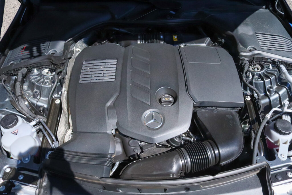 Motor (8/10) Debaixo do capot encontramos o motor quatro cilindros em linha, turbo, Diesel associado a um sistema mild hybrid de 48V. Esta solução, a de topo nas opções Diesel, debita 265 cv e 550 Nm de binário, potência suficiente para acelerar dos 0 aos 100 km/h em 5,7 segundos e atingir os 250 km/h de velocidade máxima. Durante o nosso ensaio o C 300 d mostrou ser um carro “despachado”, principalmente desde baixa rotação graças à entrega do binário máximo ainda antes das 2000 rpm. Este motor tem um trabalhar suave e o nível de ruido é contido, fazendo-se apenas sentir quando chegamos perto do “red line”. Esta solução está associada a uma transmissão automática de nove velocidades que mostrou ter passagens suaves e quase impercetíveis.