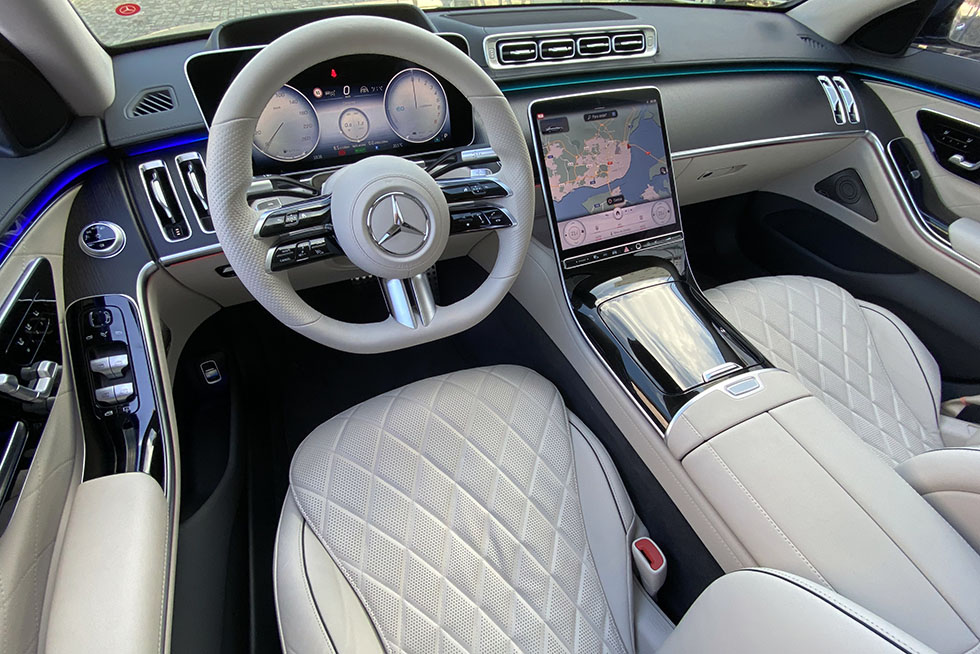 A primeira impressão que temos assim que nos sentamos ao volante no Classe S é muito positiva. A posição de condução é a seguir a excelente, pois as inúmeras regulações disponíveis permitem que fiquemos sentados como bem entendermos. Os comandos que são apenas sensíveis ao toque eram dispensáveis e as mensagens do sistema a insistir que temos de olhar para as seis luzes que estão na instrumentação também, pois bastam apenas uns segundos para encontrar uma posição perfeita e mais outros para ligarmos as massagens. As almofadas nos encostos de cabeça são o toque final perfeito. Na unidade ensaiada não estava presente o MBUX Hyperscreen que a Mercedes-Benz tanto destaca, mas o monitor existente nesta versão é mais do que suficiente e também já conta com uma excelente resolução.