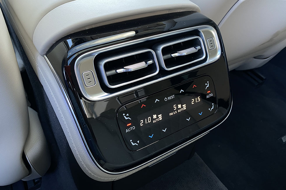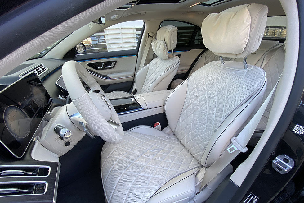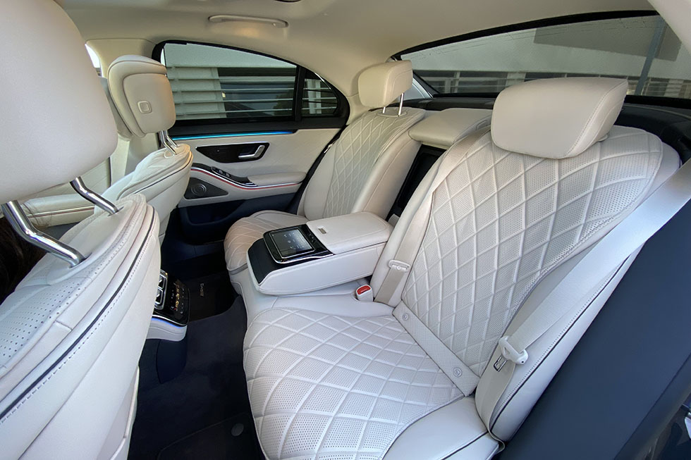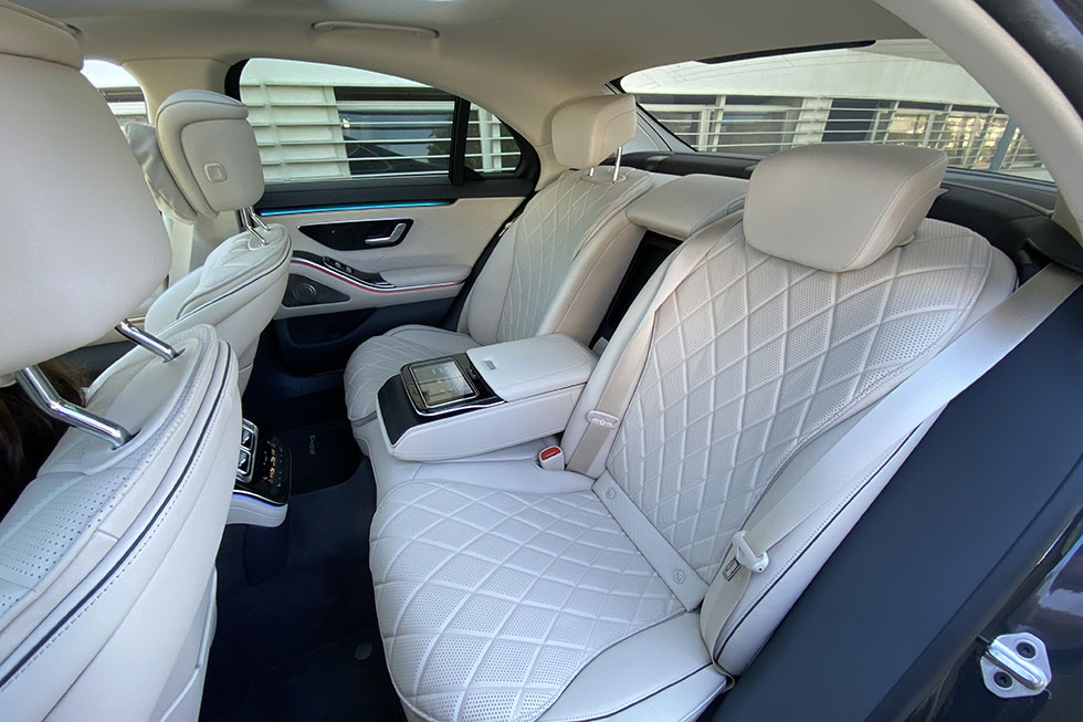 Nos lugares traseiros, o espaço disponível é bastante amplo em todas as medidas e a privacidade é muito maior. Há cortinas laterais, uma traseira e uma no tejadilho, destinada apenas aos lugares traseiros e com abertura independente. São todas elétricas, claro, e podem-se controlar através da unidade de comando que se encontra no apoio de braços, tipo um tablet mais compacto. Se não lhe apetecer levantar os braços, pode apenas pedir à assistente de bordo que as abra ou feche, começando a frase por “Olá Mercedes”. E já agora, ela que também invente uma desculpa para as pessoas que insistem em tirar-nos do carro quando chegamos ao destino. Não queremos.