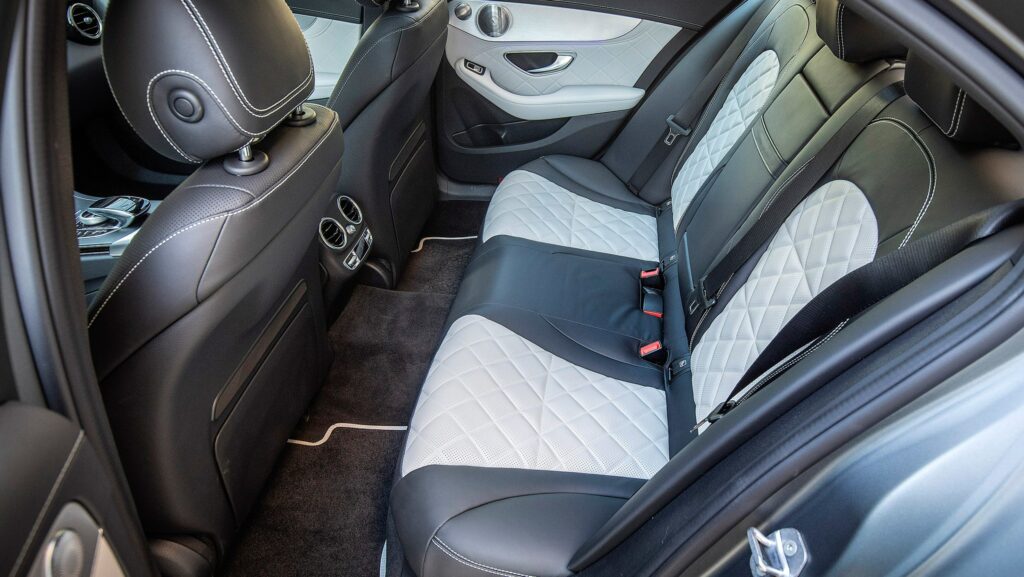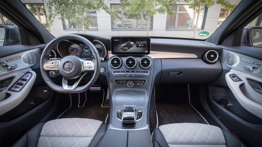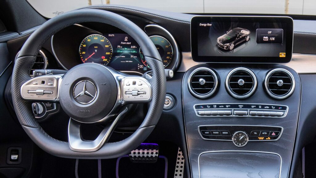 O interior, nesta versão híbrida, continua a mostrar o mesmo sentido de opulência, qualidade e bom gosto que já se conhece. Os revestimentos têm qualidade e tudo está colocado no local certo. Os bancos em pele e tecido são confortáveis e acolhedores. O maior problema do interior do Classe C é o… Classe A. Pois é, aqui ainda não temos os dois ecrãs juntos que fazem o painel de instrumentos e o ecrã do sistema de info entretenimento. E a verdade é que o sistema não é tão fluído como no Classe A e é por aqui que se sente maior necessidade de renovação do Classe C. O espaço é suficiente e a bagageira não é muito grande, mas aceita-se porque está na média dos concorrentes.