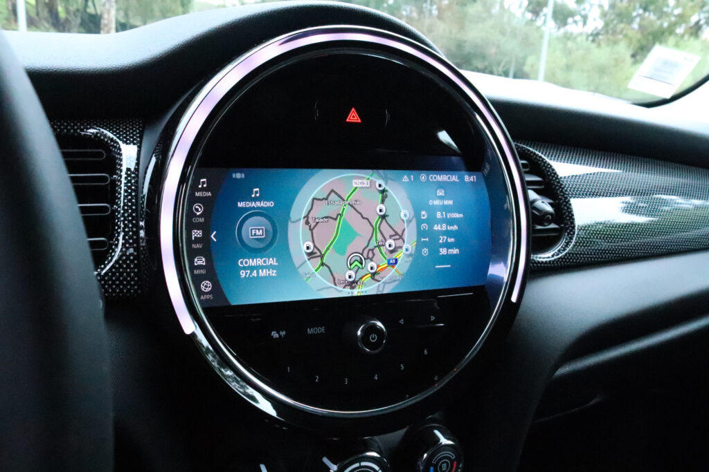 Equipamento (7/10) Tal como já foi referido, o Mini One não tem o mesmo recheio de equipamento dos Cooper, porém, a lista de opcionais é vasta. A unidade em questão conta com alguns como é o caso da Eco-Pele carbon black (81€), kit de reparação de pneus (41€), barras de tejadilho (203€), exterior piano black (244€), vidros com proteção solar (244€), Mini Driving Assistant (585€), Bluetooth avançado com carregamento wireless (285€), versão classic (2114€), jantes de 16 polegadas (732€) e superfície interior silver chequered (81€).