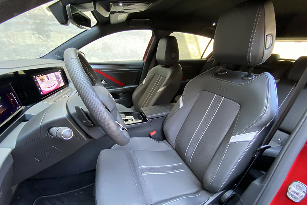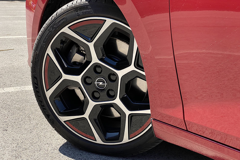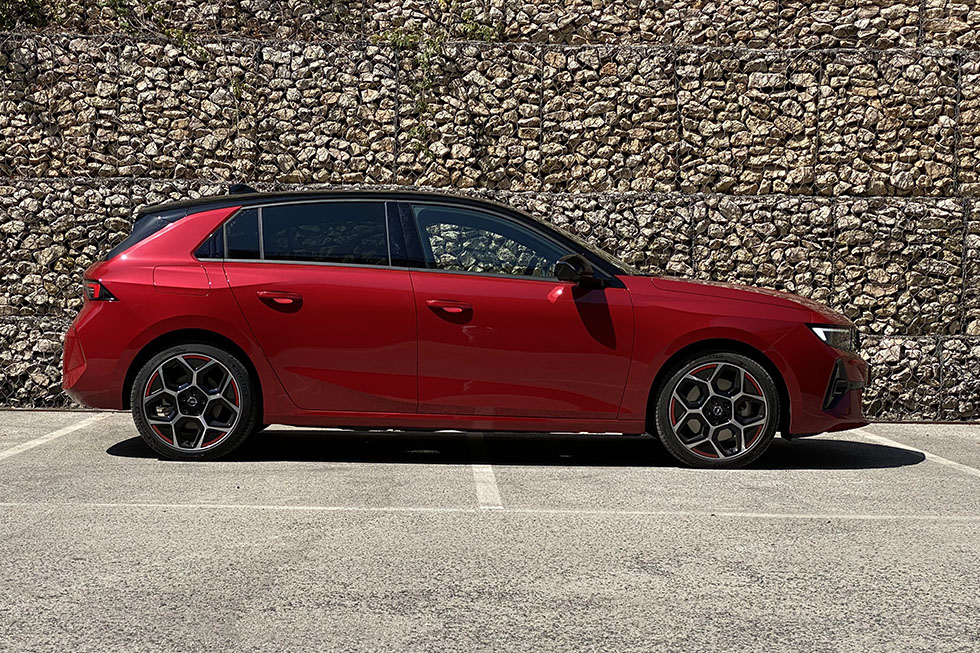Antes de chegarem as versões GSe já anunciadas para o início do próximo ano, a GS Line que nos foi disponibilizada para este ensaio é a que oferece o visual mais desportivo. Conta com pára-choques de visual mais agressivo e um acabamento escurecido em todos os logos e letras que compõem o nome deste modelo. Além disso, há ainda a possibilidade de incluir uma pintura de dois tons com o tejadilho em negro e um conjunto de jantes com a mesma escolha e com um visual mais escuro. No caso da unidade ensaiada, a presença da carroçaria pintada em Vermelho Kardio metalizado, fez com que as jantes passassem para a opção de 18 polegadas com inserções em vermelho e que contribuem para o visual mais sofisticado desta nova geração do Opel Astra. E neste caso, há diversos elementos no habitáculo que também recebem a mesma cor, ficando com um ambiente um pouco mais exclusivo.