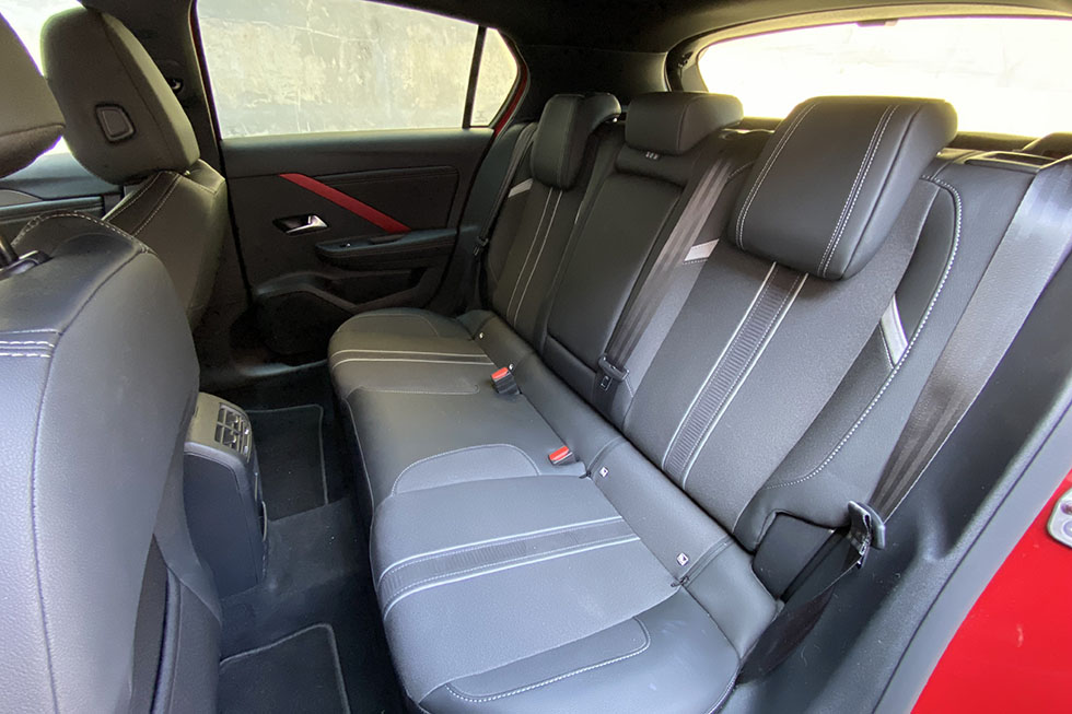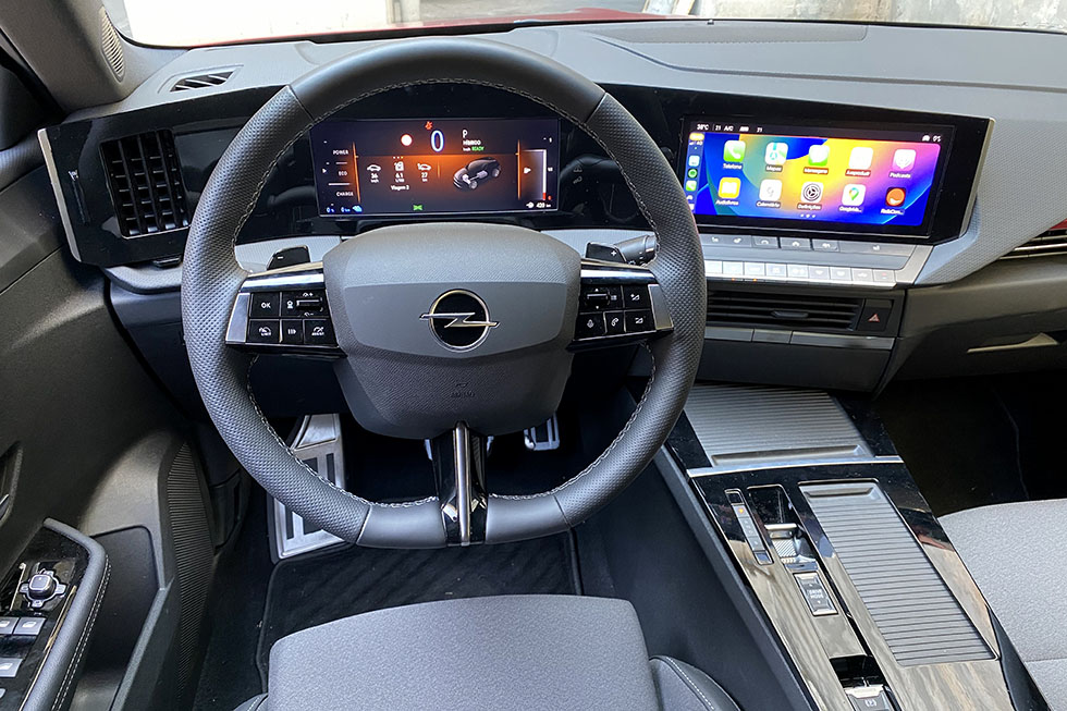 Uma vez a bordo é onde notamos muitas das semelhanças com outros modelos do Grupo Stellantis, começando na chave do carro e passando pelo desenho de diversos componentes, tais como o comando da caixa de velocidades automática, por exemplo, mas também de diversos botões e outros detalhes. O que não se compara com o Peugeot 308, no entanto, é a posição de condução, que assume aqui uma postura mais convencional, com um volante de tamanho correto e que serve de moldura para o painel de instrumentos, o que resulta numa posição ao volante bastante confortável e prática. Mantendo a tradição de modelos mais recentes da Opel, os assentos dianteiros incluem a certificação da AGR, garantindo uma boa ergonomia e conforto, e o espaço disponível, não sendo uma referência, é suficiente para que quatro pessoas consigam viajar com uma dose elevada de conforto. Lá atrás, há ainda uma bagageira com 352 litros de capacidade, já com os 70 litros necessários para as baterias do sistema híbrido diminuídos do valor original.
