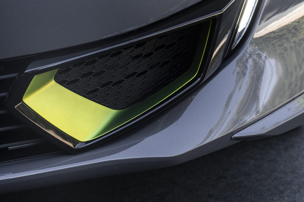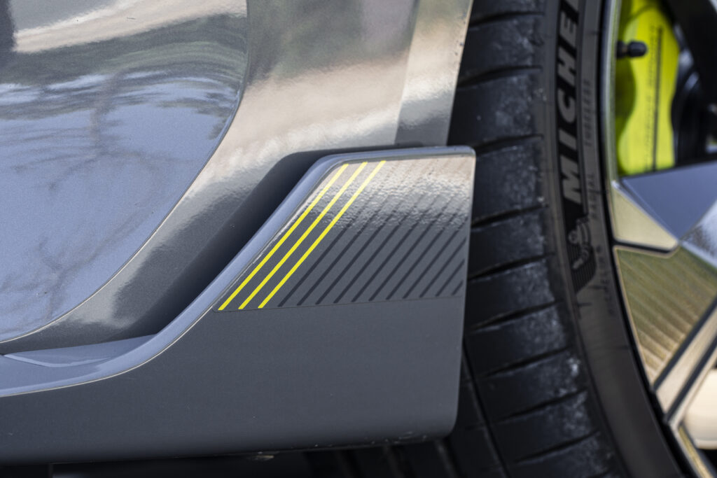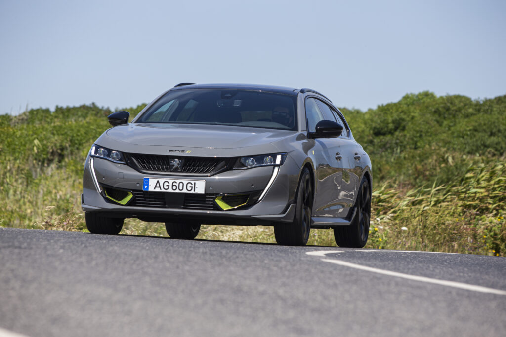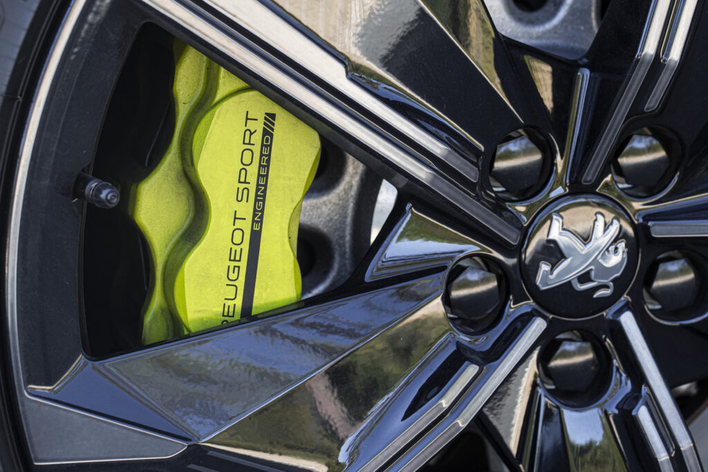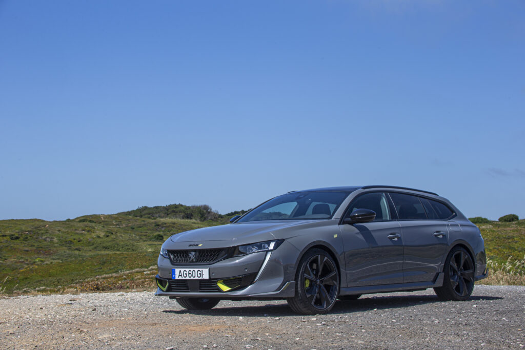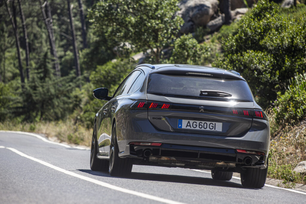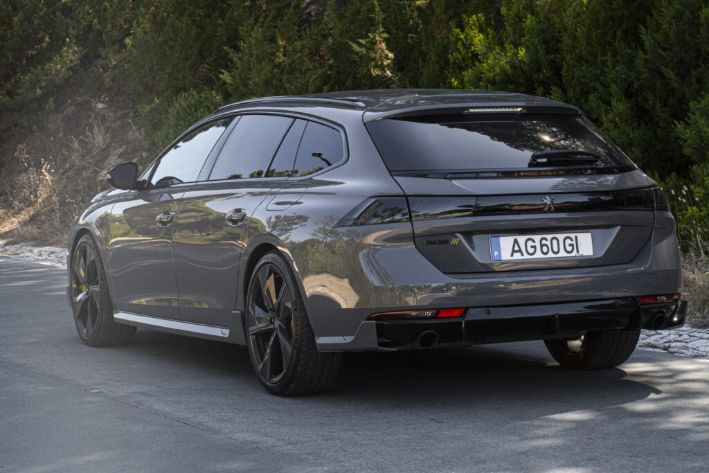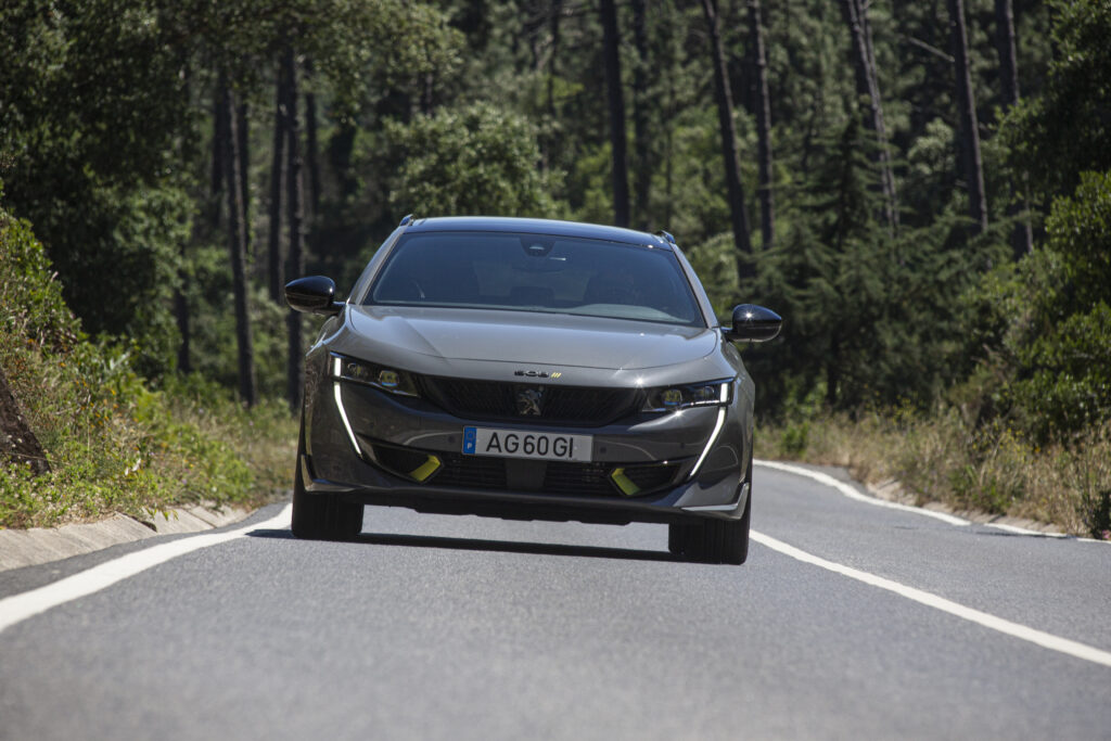 Exterior (9/10) Começando pelo exterior, mantém as belas linhas já reconhecidas do 508, mas com um toque mais “picante”. A nova variante 508 PSE, que testámos na carroçaria mais familiar, SW, destaca-se, desde logo, por um carácter mais agressivo graças à inclusão de apêndices aerodinâmicos nas laterais inferiores dos para-choques e saias laterais. De referir que a sigla PSE é caracterizada pelas três “garras” na cor “Kryptonite”, detalhe esse que podemos encontrar em vários locais da carroçaria como é o caso das laterais, dianteira e tampa da mala. Esta mesma cor encontra-se em outros componentes da carroçaria, nomeadamente nas entradas de ar dianteiras ou pinças de travão. Isto é acompanhado por jantes de 20 polegadas com pneus Michelin Pilot Sport 4S, vias alargadas e uma nova afinação de suspensão que aproxima o modelo ao solo quando comparado com as versões GT.
