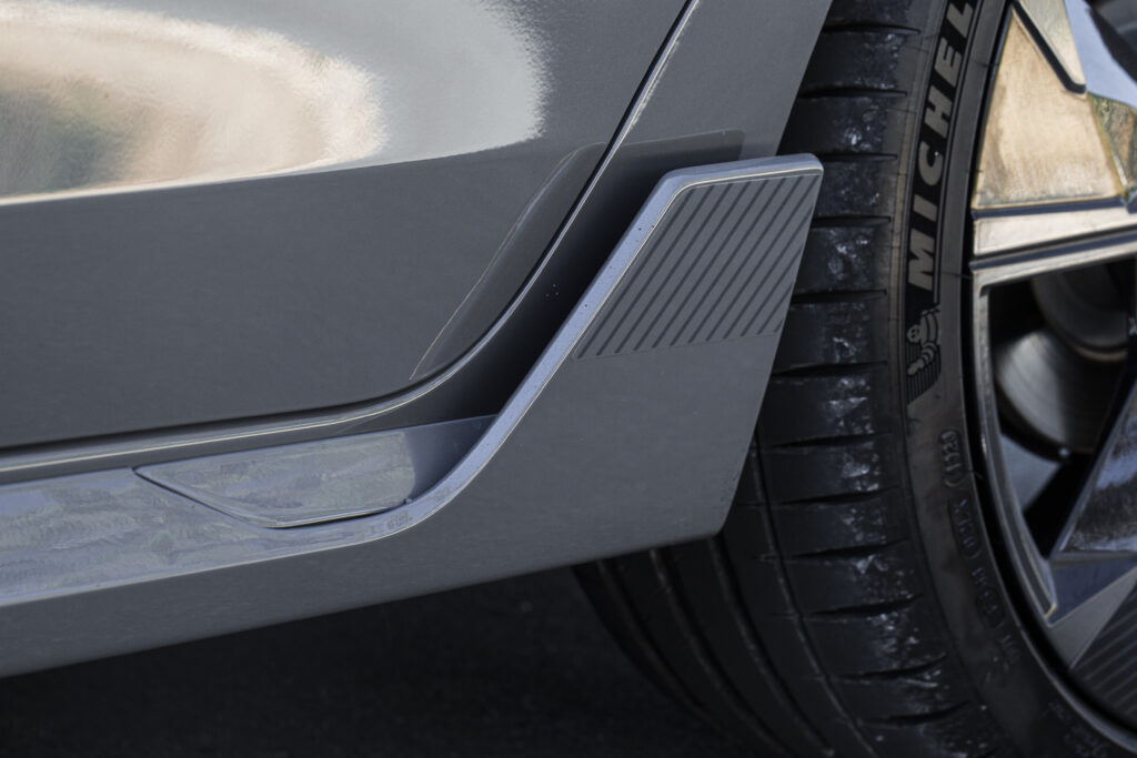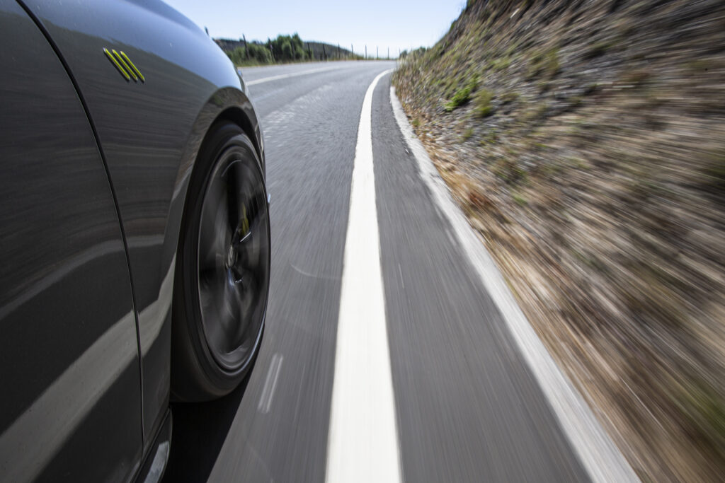 Já no modo desportivo, a afinação mais firme confere uma agilidade e dinâmica satisfatórios, apesar dos 1875 kg de peso. Os travões de disco de 380 mm com pinças fixas de 4 pistões deram “conta do recado” num ritmo mais acelerador e nem um longo período de uso abusivo fez com que a temperatura subisse de forma excessiva. É também na travagem que sentimos um tato diferente das variantes a combustão, uma vez que a primeira parte do pisar prende-se com a travagem regenerativa e, por isso, não é tão progressivo.