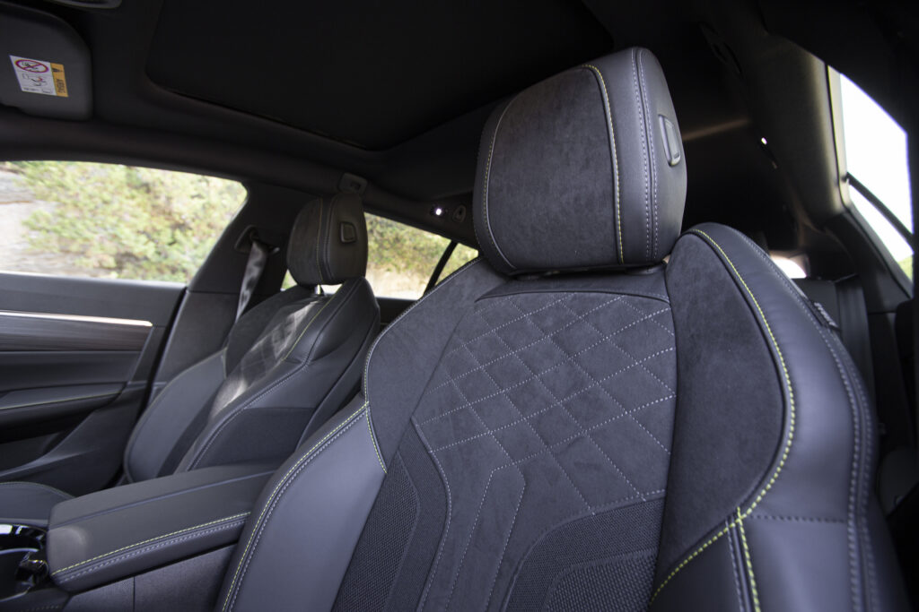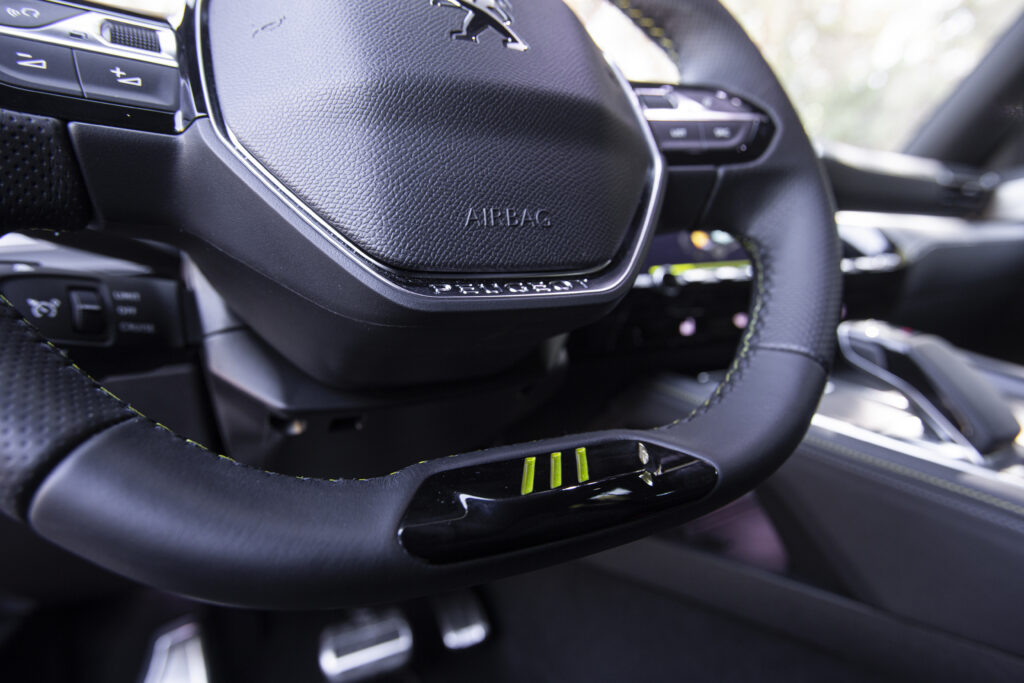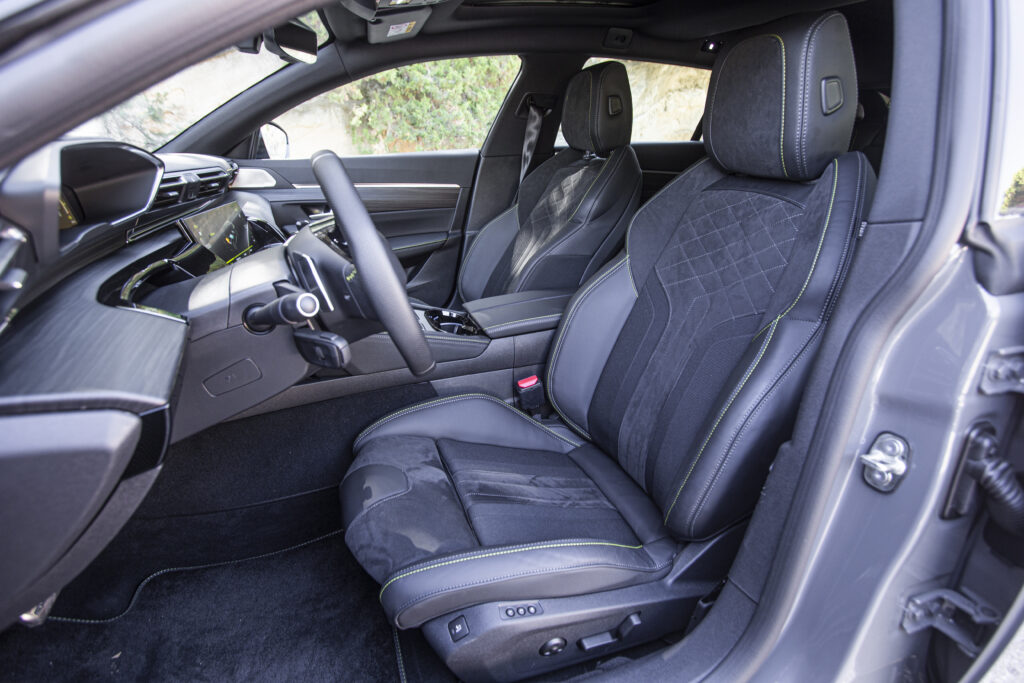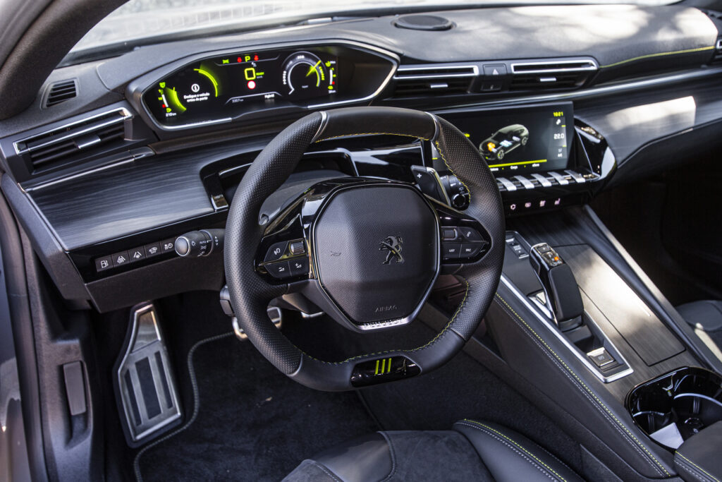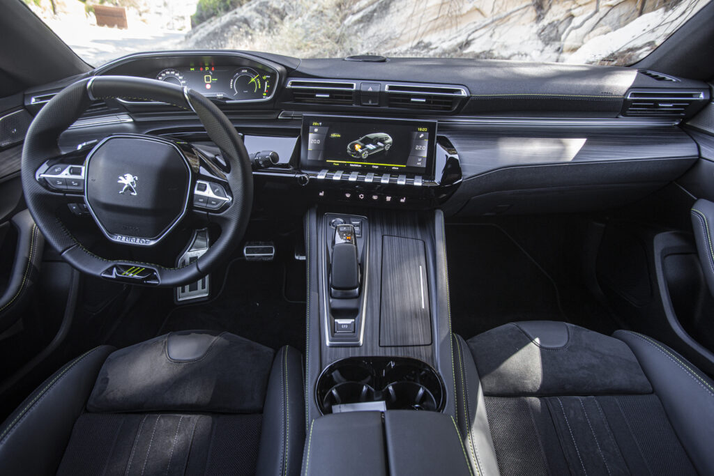 Interior (8/10) O interior mantém a irreverência do exterior ao apresentar-se com um design moderno e já conhecido das restantes variantes do 508, contudo, com características exclusivas desta variante PSE. Assim, ao abrir da porta, somos presenteados por um volante tipicamente Peugeot, ou seja, recortado e com dimensões compactas e posicionado numa zona mais baixa e conta com as três garras em verde fluorescente. Atrás do mesmo, encontramos o painel de instrumentos digital (i-Cockpit) que é um dos mais completos do mercado ao incorporar de série, inclusive, uma câmara de visão noturna que emite avisos visuais e sonoros quando deteta pessoas ou animais nas imediações da estrada.