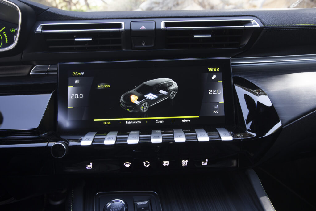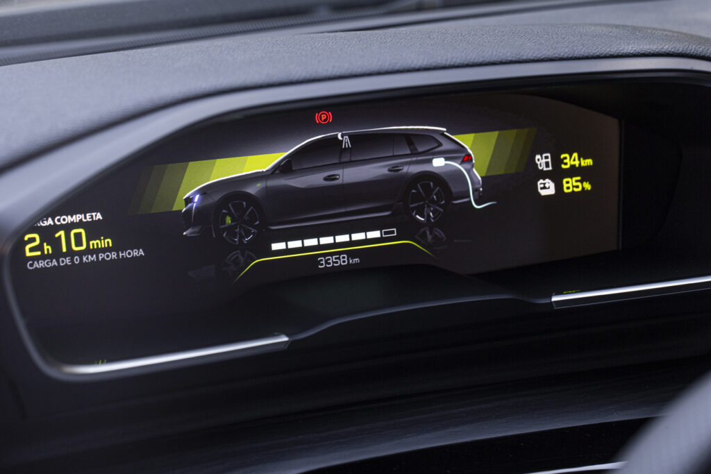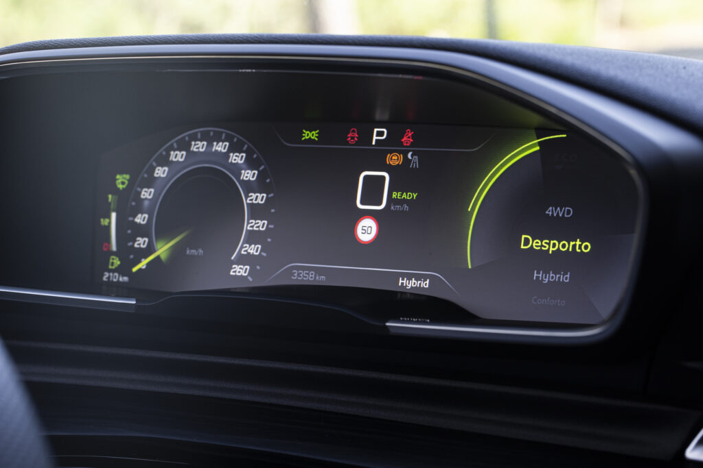 Motor (8/10) Debaixo do capot desta Peugeot 508 SW PSE encontramos o já conhecido motor a combustão quatro cilindros de 1.6 litros PureTech. Este é acompanhado por dois motores elétricos, um por eixo, que garantem uma potência combinada de 360 cv e 520 Nm de binário. A potência chega às quatro rodas motorizes através da transmissão automática EAT8 de oito velocidades e, ao nível de performance, é possível acelerar dos 0 aos 100 km/h em 5,2 segundos. Os motores elétricos são alimentados por uma bateria de 11,5 kWh que garante uma autonomia anunciada de 46 km com um único carregamento. Durante o nosso ensaio, conseguimos realizar 38 km em modo 100% elétrico, valor esse que pode subir para os 41 km em ambiente exclusivamente citadino.