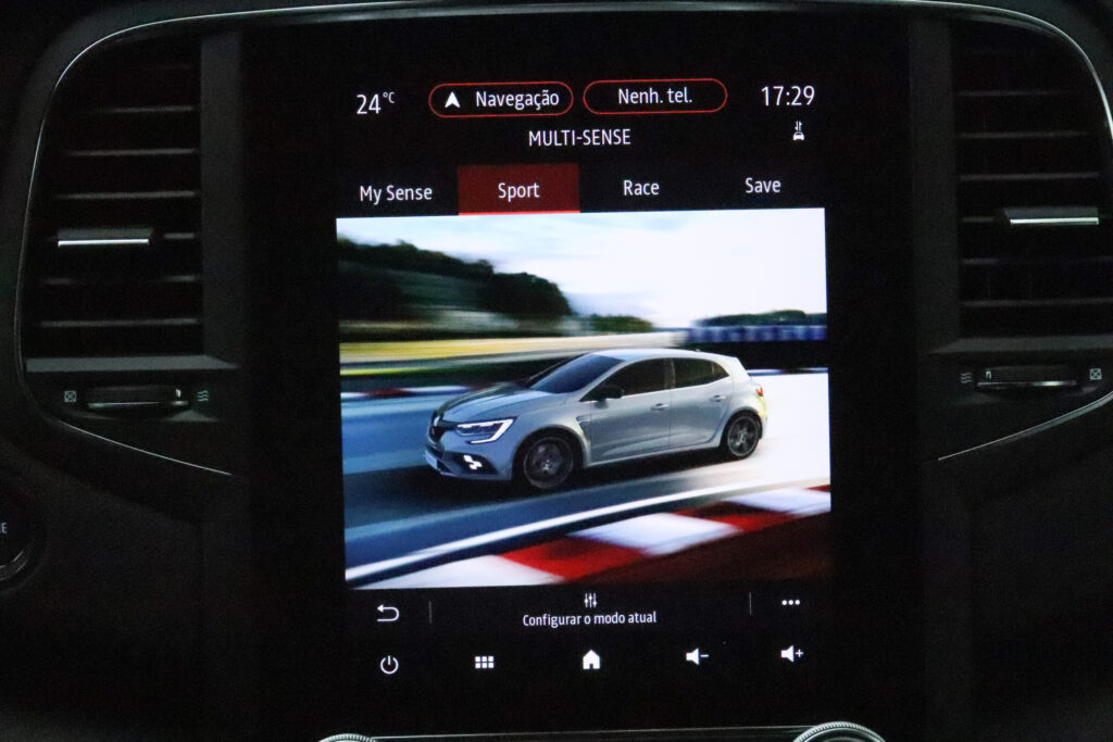 Equipamento (8/10) O Renault Mégane R.S. Trophy é o nível intermédio do desportivo francês, só atrás do “todo poderoso” R.S. Trophy-R. Os grandes destaques de equipamento deste desportivo passam pela inclusão de série do chassis CUP e diferencial autoblocante mecânico Torsen. Tudo isto é acompanhado por um bom recheio tecnológico com o renovado sistema de infotainment, painel de instrumentos digital e assistentes à condução como é o caso de câmara traseira, sensores de estacionamento, avisador de saída de faixa entre outros. Relativamente a opcionais as soluções são muito poucas, um dado que acaba por ser positivo porque significa que grande parte do equipamento é de série.