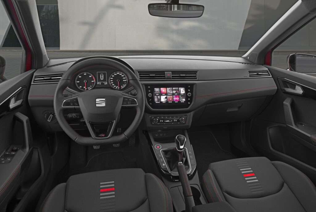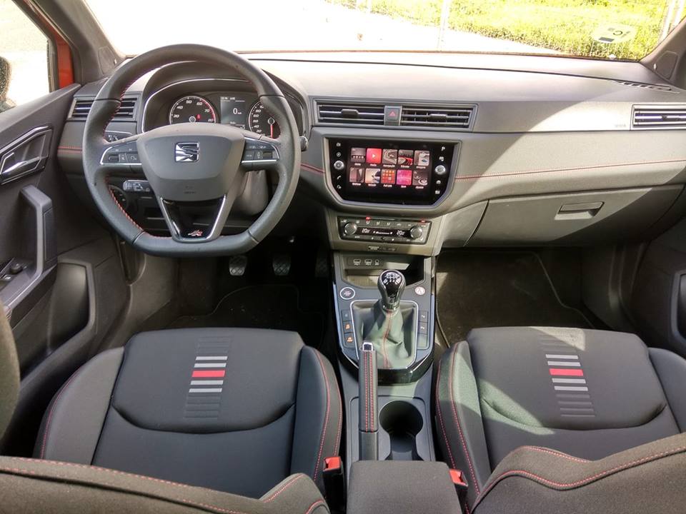 No habitáculo, os apontamentos desportivos são ainda mais evidentes que no exterior, primando, contudo, o conjunto mais uma vez, pelo equilíbrio. Uma faixa com pespontos vermelhos no tablier, no interior do volante, no travão-de-mão, no fole da alavanca de velocidades e nos excelentes bancos, com maior apoio lateral, que combinam pele e tecido e evidenciam um desenho específico dão um carácter “racing” ao Arona cujo volante com diversos comandos e base plana, apresenta uma discreta inscrição “FR” para que não restem dúvidas tratar-se da versão mais desportiva.