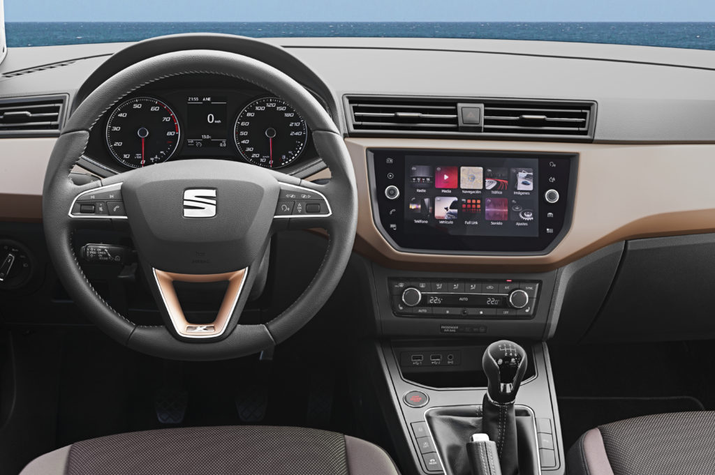 No que toca ao sistema de info entretenimento, a Seat decidiu seguir o seu caminho, recusando a moda dos ecrãs flutuantes à imagem dos tablets. No Ibiza há três níveis de ecrã (preto e branco, 6 e 8 polegadas a cores) e um enorme plástico pintado de preto brilhante a enquadrá-lo. Em algumas versões há uma enorme régua da cor do carro que atravessa todo o tabliê. Não choca e está bem montado.