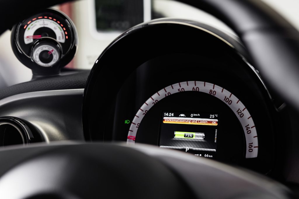 Mas se, no exterior, é a decoração que, basicamente, garante diferenciação ao Forfour ED face às restantes versões, no interior do habitáculo, as diferenças fazem-se notar, basicamente, através das informações fornecidas pelo ecrã TFT a cores, que surge no centro do painel de instrumentos, e onde é possível observar, desde o nível de carga da bateria até ao tipo de condução realizada a cada momento (mais ou menos poupada). Além de no pequeno mostrador independente colocado na parte superior do tablier, à esquerda do volante, e cuja principal finalidade é indicar não somente a percentagem de potência utilizada a cada momento, mas também o estado da carga da bateria. Sendo que, em ambos os casos, a leitura é de fácil compreensão.