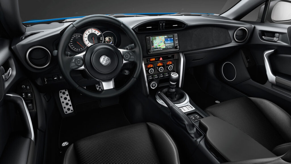 O GT-86 tem jantes de liga leve de 17 polegadas, ar condicionado de dupla zona, acesso e arranque mãos livres, vidos elétricos, sensores de chuva e luz. Depois pode optar pelas pinturas metalizadas (entre 500 e 750 euros) e… nada mais, pois o sistema de navegação é de série, como o cruise control, ligação Bluetooth e conectividade. Enfim, um equipamento muito completo nesta Black Touch Edition.