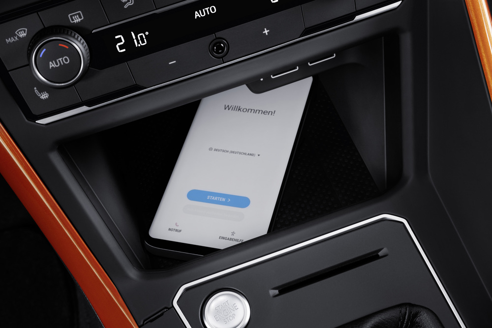 À frente o ecrã central está direcionado para o condutor, num elegante painel em preto brilhante que acompanha o tablier até à instrumentação. No ecrã tátil, por via do sistema de navegação Discover Media (768€), podemos aceder aos seguintes menus: rádio, media, car-net, app-connect, telefone, veículo, navegação, trânsito, imagens, ajustes, som e VW Media Control. Através destes é possível ter acesso aos serviços de conectividade Android Auto, Apple CarPlay e MirrorLink. Nota também para o carregamento por indução.