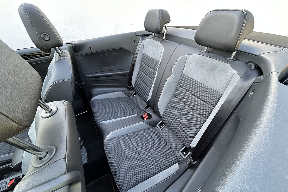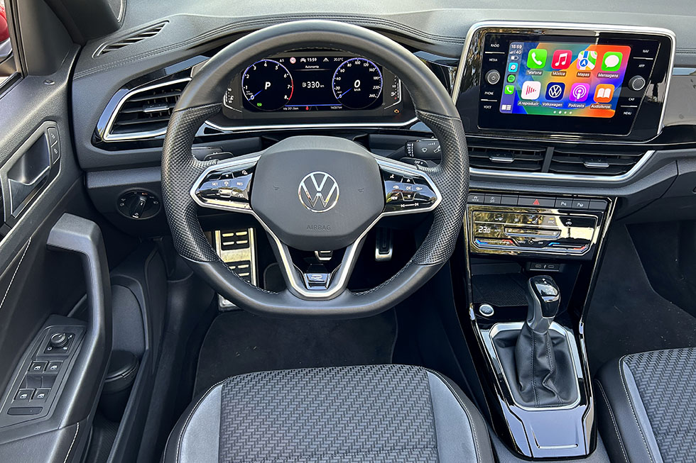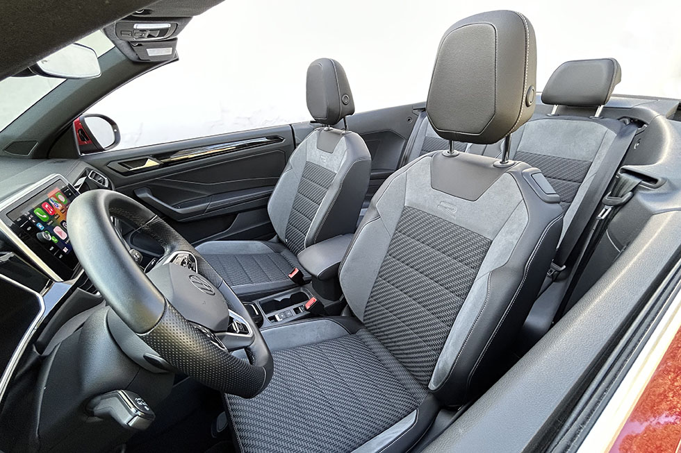 A atualização recente do Volkswagen T-ROC trouxe uma maior perceção de qualidade, através de materiais mais macios na zona superior do tablier e de um conjunto de acabamentos que estão, de facto, mais cuidados. Além disso, e por se tratar de uma versão R-Line, este T-ROC Cabrio também inclui os assentos com um forro mais cuidado, com dois tipos de tecido e um formato que contribui para uma boa posição de condução, tal como a amplitude das regulações que estão disponíveis.