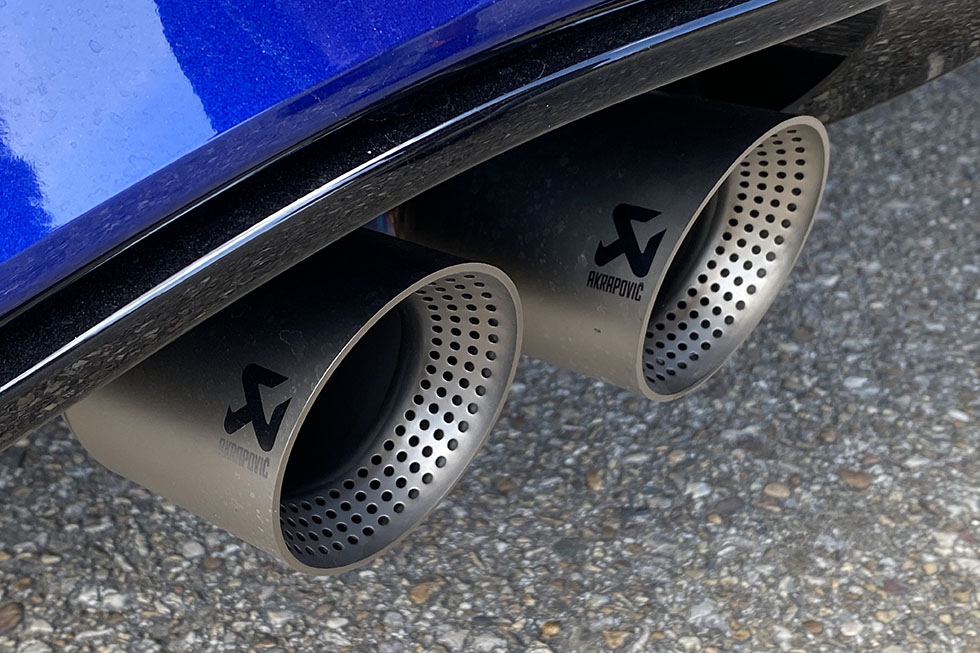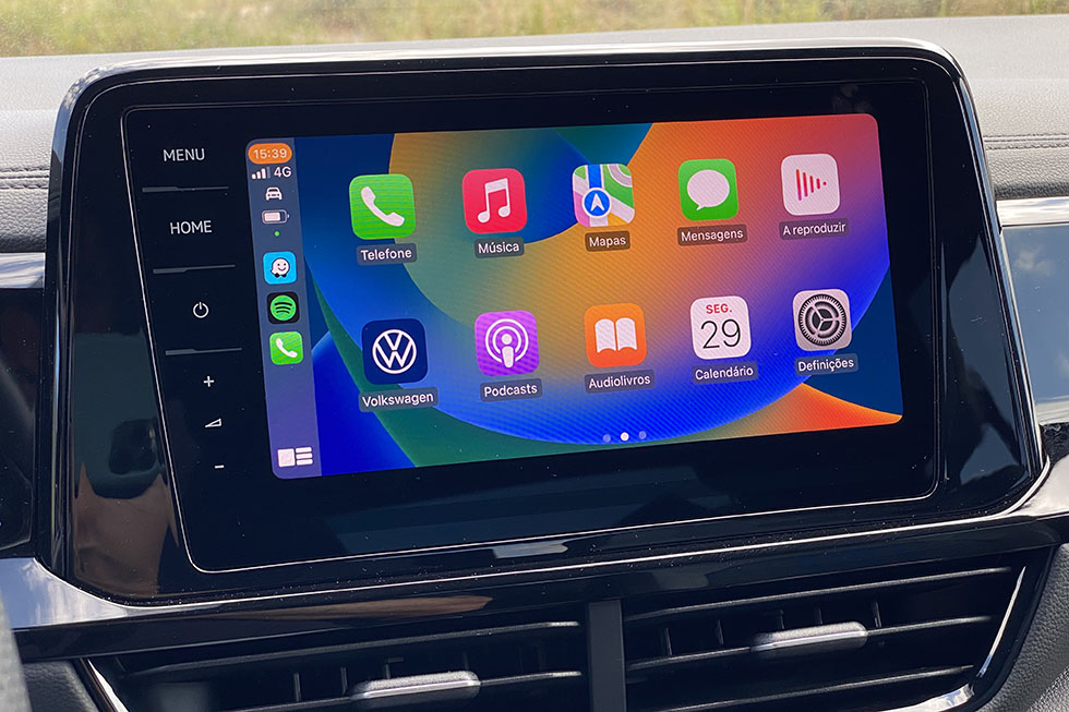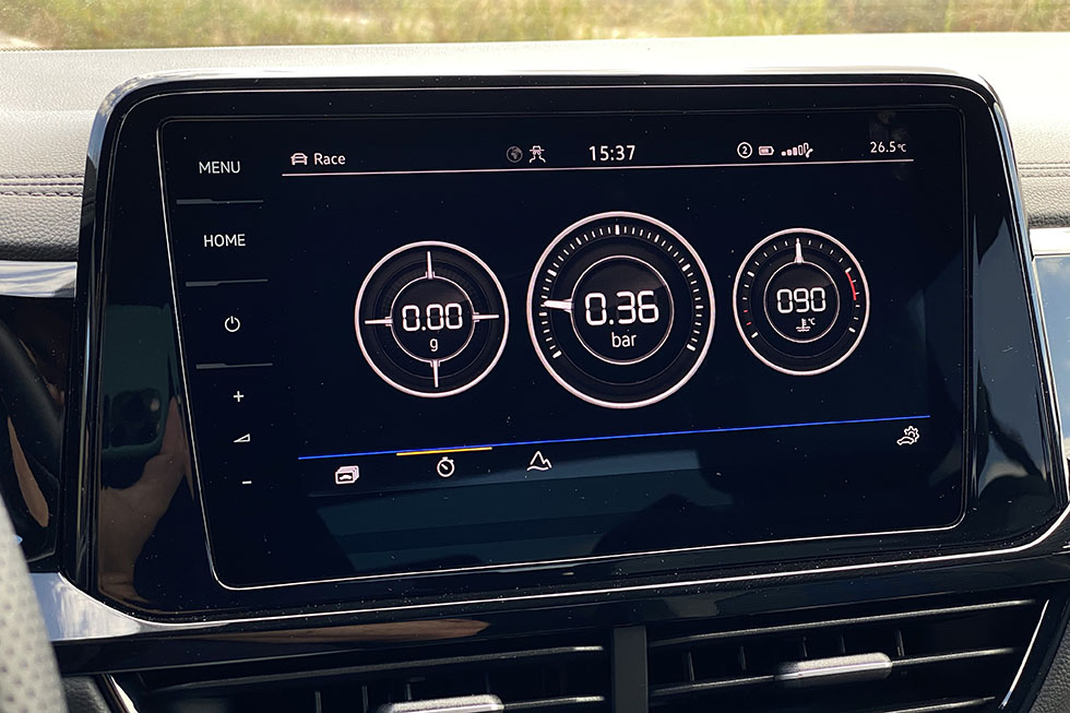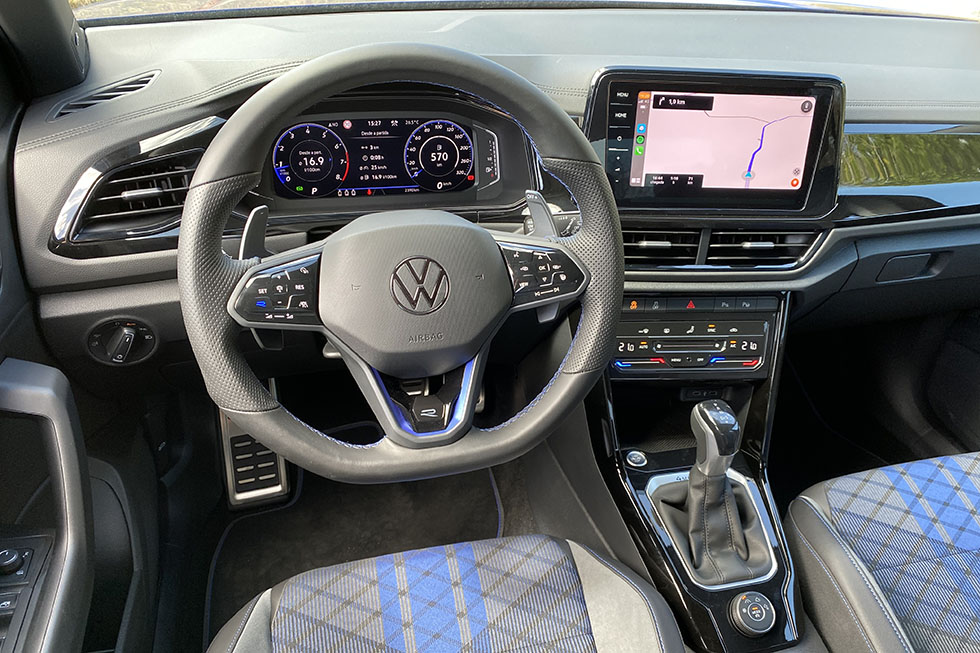 Mesmo em frente ao condutor, o painel de instrumentos totalmente digital oferece uma boa leitura e tem várias hipóteses de visualização, com as informações que gostamos de ir vendo. E um pouco mais ao centro, está o habitual monitor tátil para o sistema multimédia, onde marcam presença alguns mostradores mais desportivos, que são um exclusivo desta versão, tal como o da pressão do turbo ou o medidor de forças G, laterais e longitudinais. No mesmo ecrã, podemos espelhar o conteúdo do telefone através das funções Apple CarPlay ou Android Auto numa versão sem cabos, mas também a camara de estacionamento traseira e muitas das configurações do T-ROC. O sistema de iluminação em LED também faz parte do equipamento de série, mas o sistema LED Matrix já é uma das opções que estava presente na unidade ensaiada, tal como as jantes de 19 polegadas, o controlo adaptativo do chassis, o acesso sem chave, o sistema de navegação e o sistema de escape Akrapovič, que representa quase quatro mil euros no valor final deste modelo, ainda que tenha uma sonoridade incrível.