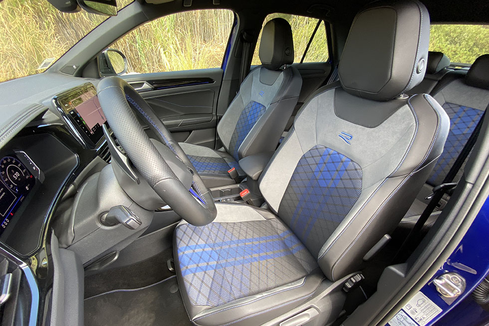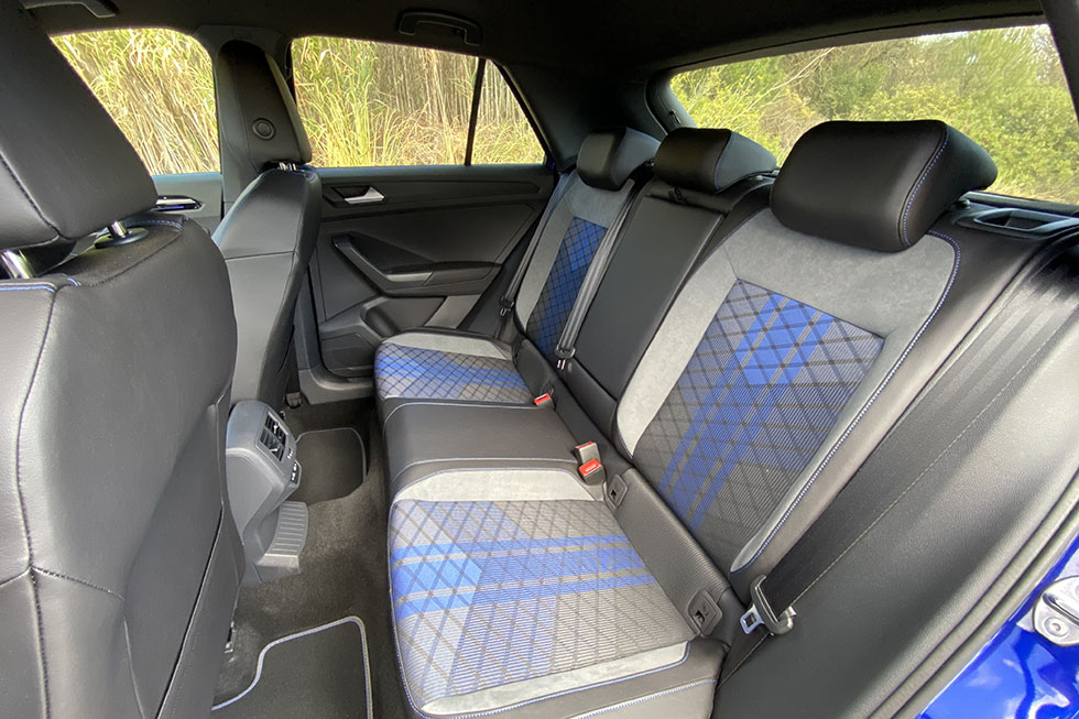 No habitáculo do novo T-ROC é onde notamos o mais incremento de qualidade face à geração anterior. No topo do tablier há agora materiais mais agradáveis ao tato e, de uma forma geral, é fácil perceber que houve um enorme trabalho para conquistar um patamar qualitativo mais elevado, ainda que de uma forma que não catapultasse o preço para valores (ainda mais) proibitivos. Apesar disto, há coisas que ainda custam a descobrir, tal como a diferença entre o painel interior das portas dianteiras e das traseiras. Na frente, há um friso escuro brilhante com a acabamento a lembrar a fibra de carbono, uma linha de LED azul na iluminação ambiente e uma zona forrada em pele e com costuras em azul, combinando com o resto do conjunto. Atrás, não há nada disso. Apenas o mesmo padrão nos assentos, tal como os desportivos que estão na frente, mas sem o logo ‘R’ nas costas. E na zona inferior do habitáculo, ainda há materiais rígidos e pouco compatíveis com o valor deste T-ROC.