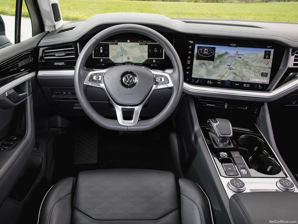 No habitáculo a diferença é abismal face às anteriores gerações que, para mim, sempre me pareceu um Golf em tamanho gigante. Com esta terceira geração, o Touareg passa a ter um interior de carro grande, de modelo Premium, com qualidade e, sobretudo, muita tecnologia. E digam lá que não é agradável entrar dentro de um SUV de dimensões generosas e à nossa frente encontramos um volante, conhecido é verdade, mais dois ecrãs gigantes, um a fazer de painel de instrumentos e outro para o sistema de info entretenimento? A ausência de botões surpreende, mas perante o ecrã central, percebe-se que a Volkswagen foi pelo caminho seguido pela Land Rover nos modelos Range Rover. Há dois comandos rotativos atrás da alavanca da caixa automática e do botão de arranque do motor e pouco mais. O Touareg é compatível com o Apple CarPlay e com o Android Auto, tem “hotspot” Wifi que permite a ligação de até 8 dispositivos ao mesmo tempo. O ambiente a bordo é excelente, se optar pelos vidros duplos e pelo para brisas com insonorização fica com um verdadeiro casulo, mas quando descemos abaixo da linha desenhada pela parte inferior do tabliê, percebemos que andam por ali alguns plásticos menos agradáveis e que não têm nada a ver com os que estão mais acima. Os modelos Premium também têm disto, por isso não posso criticar a VW por ter feito isto no Touareg. Habitabilidade não é, de todo, um problema, pois não espaço é coisa que não falta e porque a Volkswagen entendeu que o Touareg não deveria ter sete lugares, a bagageira tem massivos 810 litros de capacidade, que podem, com o rebatimento dos bancos traseiros, chegar aos 1800 litros.