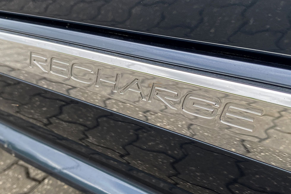 Apesar de ter chegado ao mercado há sete anos, as linhas da carroçaria do Volvo XC90 ainda continuam perfeitamente atuais e de acordo com os restantes modelos da marca. As suas constantes atualizações têm sido apenas de pormenor, evolução tecnológica ou reforço de equipamento, pelo que o atual topo de gama da marca continua a destacar-se pela imagem mais nobre e distinta, mas também pelo minimalismo nórdico e pelo tamanho imponente. Na lateral, a designação Recharge marca presença nos frisos laterais em cromado, mas também no discreto logo existente na tampa da bagageira. E depois, as assinaturas visuais em LED, tanto à frente como atrás, também anunciam a presença de um Volvo.