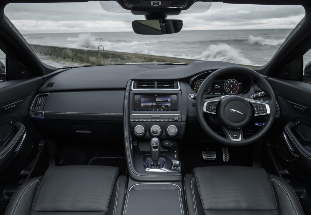 Por outro lado e confirmar o posicionamento à partida mais acessível, um painel de instrumentos de leitura fácil, mas de mostradores analógicos, além de um ecrã a cores e táctil, integrado na consola central, enquanto parte do sistema de infotainment. Mas com revestimentos menos luxuosos que no F-Pace e sem aplicações em metal.