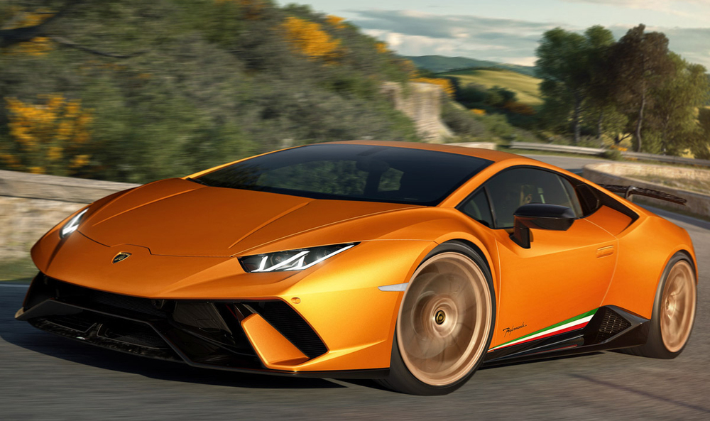Lamborghini Huracán Performante: 5204 cc, V10, 640 cv; transmissão integral, caixa automática de 7 velocidades; 0-100 km/h em 2,9s; velocidade máx. 325 km/h; 1382 kg;