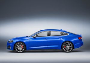 Marcado por um longo capot, maior distância entre eixos e curta distância entre o centro dos eixos e as respetivas extremidades da carroçaria. A esculpida grelha Singleframe é significativamente mais plana e ampla do que na geração anterior deste modelo de cinco portas. A linha de ombros em forma de onda é agora tridimensional, criando uma interação de luz e sombra. A seção traseira exibe um estilo horizontal e a extremidade da porta da bagageira termina com um característico spoiler. Os novos Audi A5 e S5 Sportback num têm faróis LED e Matrix LED com sinais de mudança de direção dinâmicos, opcionais. Farolins em LED tridimensionais e grande luz de travagem no topo do óculo traseiro, de série.