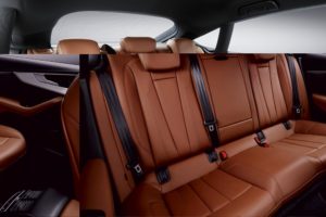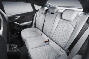 O incremento das dimensões e a maior distância entre eixos beneficiam o espaço interior. O habitáculo ganhou 17 mm de comprimento e a quota ao nível dos cotovelos para o condutor e passageiro dianteiro aumentou até 9 mm e 11 mm, respetivamente, enquanto o espaço para as pernas atrás também teve um significativo incremento de 24 mm. A iluminação ambiente em LED (de série) destaca uma escolha de 30 tons reguláveis para o interior. O novo A5 Sportback também redefine o valor de referência da categoria em termos aero acústicos. A bagageira é de 480 l. A Audi também oferece esta variante de cinco portas com controlo elétrico por movimento (de série) para abrir a tampa do compartimento de bagagem através de um movimento do pé. De série, o banco traseiro é rebatível. Totalmente rebatidos permitem que a capacidade da bagageira ascenda até 1.300 litros.