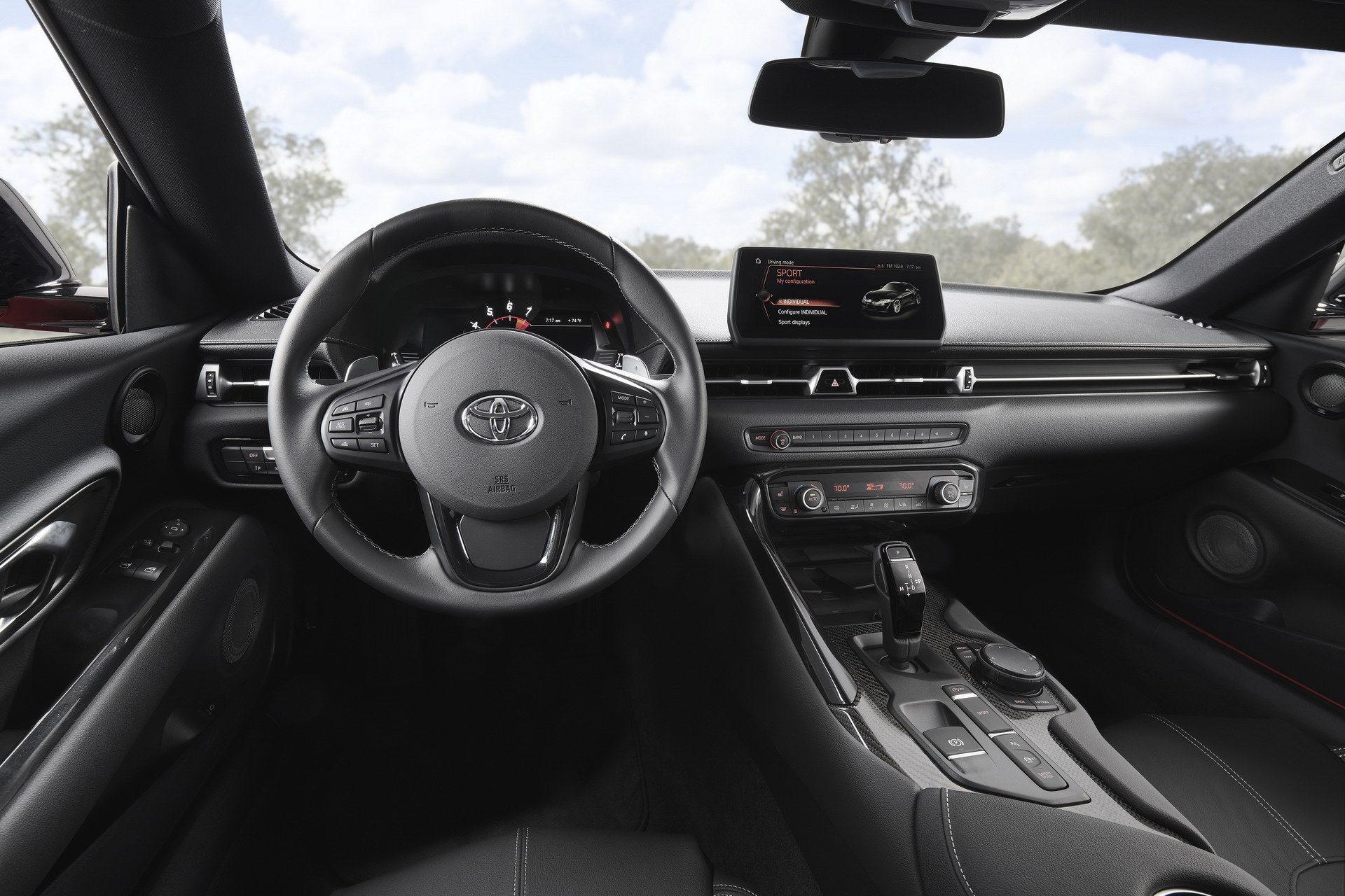Já no interior, até parece que entramos dentro de um BMW, tal a quantidade de peças oriundas do Z4. Basta olhar para as fotos e ver que na consola central, na alavanca da caixa, no ecrã do sistema de info entretenimento, enfim, no sistema de climatização. Tivesse a Toyota escolhido outro caminho e aproximado o Supra do protótipo FT-1 Concept e “outro galo cantaria”. Ainda assim, a Toyota diz que o interior foi inspirado pelos monovolumes com tudo desenhado para maximizar a visibilidade. O painel de instrumentos é digital e é exibido num ecrã de 8,8 polegadas, exatamente o mesmo tamanho que o ecrã que encima a consola central. Os bancos são forrados em pele e Alcantara. A bagageira tem 290 litros, mais 9 litros que o BMW Z4. O Supra estará disponível com dois níveis de equipamento: Active e Premium. O segundo é mais refinado, recebendo bancos totalmente forrados em pele, sistema de som JBL com 12 altifalantes, um “head up display” e carregamento sem fios para smartphone.
