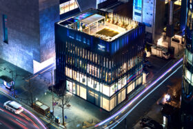 A frente do carro destaca-se pela grelha, com a matriz principal em Titânio Escuro Brilhante, acentuada por chevrons de contraste em Vermillion Gloss num padrão horizontal que flui de Beluga no centro para os lados. A linha do “capot infinito” e as jantes de 22″ possuem acabamento em Gloss Dark Titanium, com os raios em Gloss e Satin Black Titanium e detalhes em Vermillion Gloss.