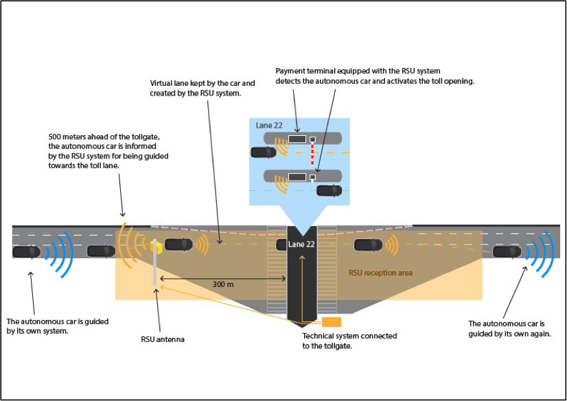 - O sistema de informação da portagem foi modificado para garantir a passagem de veículos autónomos. Ele analisa em tempo real a disponibilidade do corredor e certifica-se de que estão reunidas as condições para permitir uma passagem segura. A autorização entretanto calculada é então enviada ao veículo autónomo através da antena RSU.