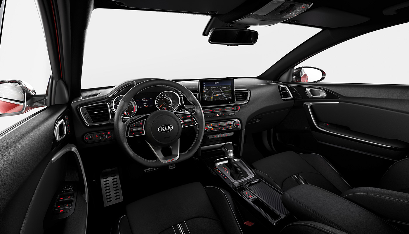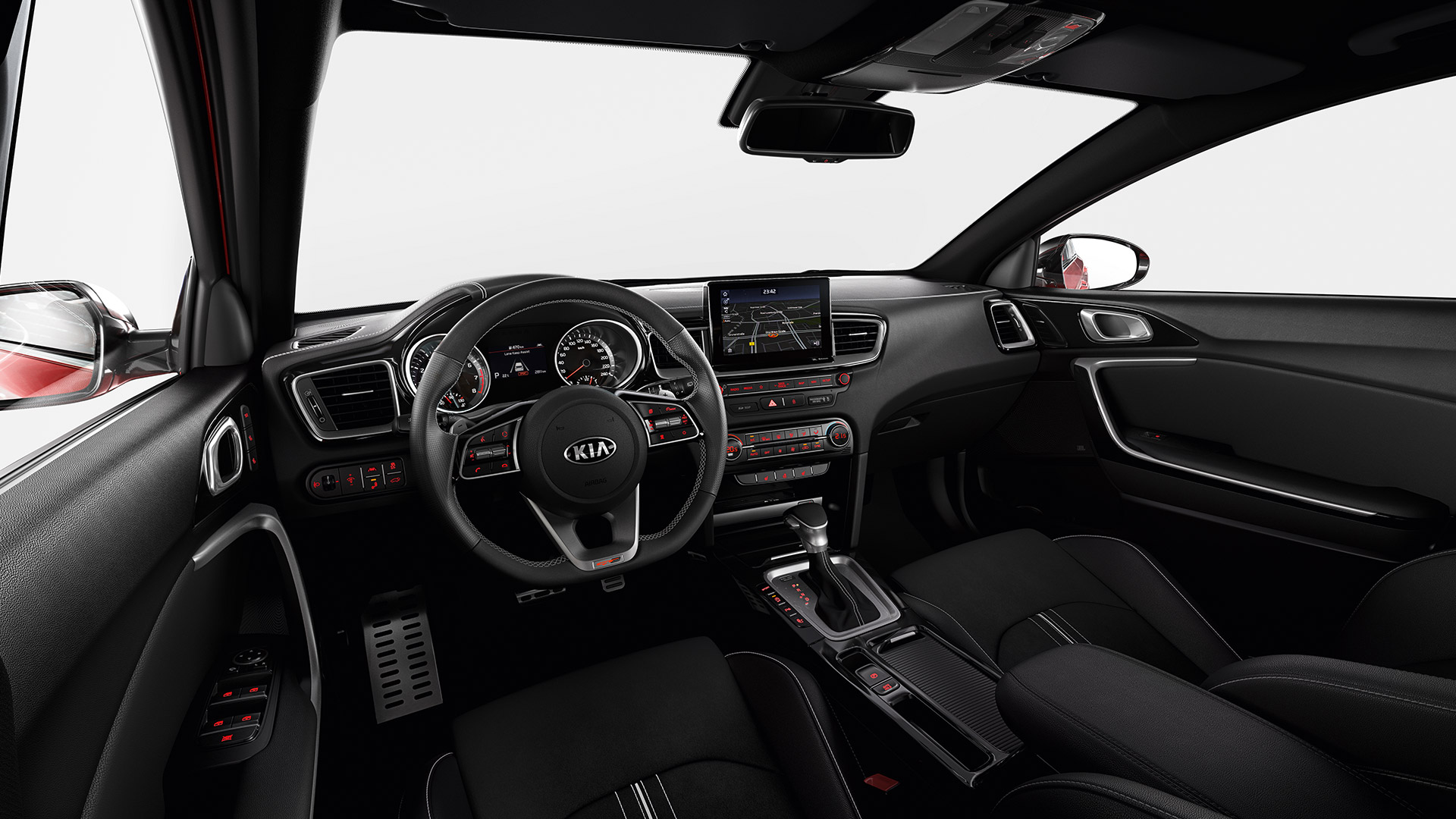 O revestimento do tejadilho cinzento do Ceed e da Sportswagon é substituído por tecido preto, as embaladeiras das portas apresentam chapas de revestimento metálicas e o volante tem, nas versões com caixa de velocidades de dupla embraiagem, patilhas de comando da caixa em metal.