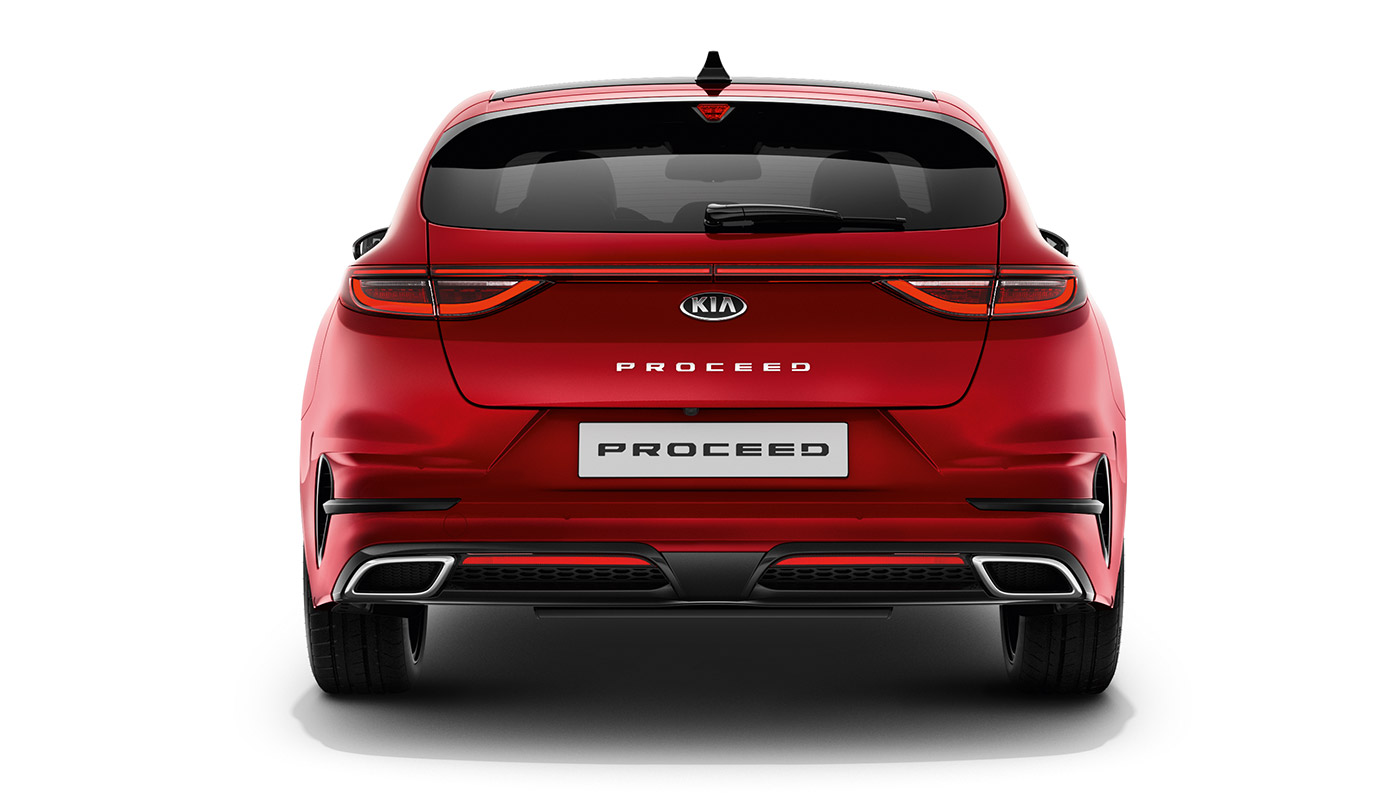 Na traseira, o portão desce mais abaixo oferecendo uma postura desportivaexibe um posicionamento mais baixo do para choques traseiro, sendo esta uma das características que permitem ao ProCeed exibir uma postura desportiva, a que se juntam a saída dupla de escape, o nome ProCeed em letras maiúsculas no centro da porta da bagageira, sob as luzes LED, que se prolongam horizontalmente a toda a largura desta.