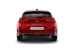 Na traseira, o portão desce mais abaixo oferecendo uma postura desportivaexibe um posicionamento mais baixo do para choques traseiro, sendo esta uma das características que permitem ao ProCeed exibir uma postura desportiva, a que se juntam a saída dupla de escape, o nome ProCeed em letras maiúsculas no centro da porta da bagageira, sob as luzes LED, que se prolongam horizontalmente a toda a largura desta.