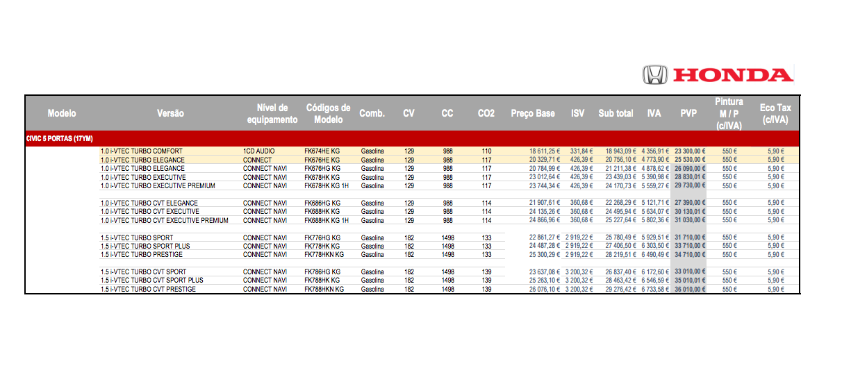 A 10ª geração do Civic está já disponível em Portugal. O modelo surge com motores VTEC Turbo 1.0 de 129cv e 1.5 de 182cv. No primeiro caso a versão de entrada, com nível de equipamento Comfort, situa-se nos 23.300€, seguindo-se 25.530€ para o Elegance, 28.830€ para o Executive e 29.730€ para o Executive Premium. Em relação ao 1.5 V-TEC Turbo, o Sport tem um custo de 31.710€, o Sport Plus de 33.710€ e o Prestige de 34.710€. A opção por caixa automática acresce 1300€ à fatura em cada versão.
