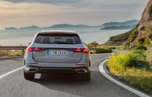 Elementos cromados de design preciso, bem como os grupos óticos traseiros bipartidos, de estilo progressivo, caracterizam o design da traseira. Graças à sua grande abertura, o compartimento de carga pode ser utilizado de várias formas. A equipa de design reinterpretou os farolins traseiros em termos dos seus contornos e funcionamento interno. Com grande profundidade de pormenor e funções parcialmente animadas, o design interior contribui para o elevado valor atrativo do automóvel. A estrela exclusiva torna inconfundível o design diurno e noturno dos farolins traseiros. As duas secções de luz no painel lateral e na porta do compartimento de bagagens estão visualmente ligadas. Este facto realça ainda mais a largura da traseira. Os refletores foram deslocados para o para-choques. Isto permite que a abertura do compartimento de carga seja particularmente grande, o que, por um lado, aumenta o valor utilitário e, por outro, faz com que a traseira pareça ainda mais larga.