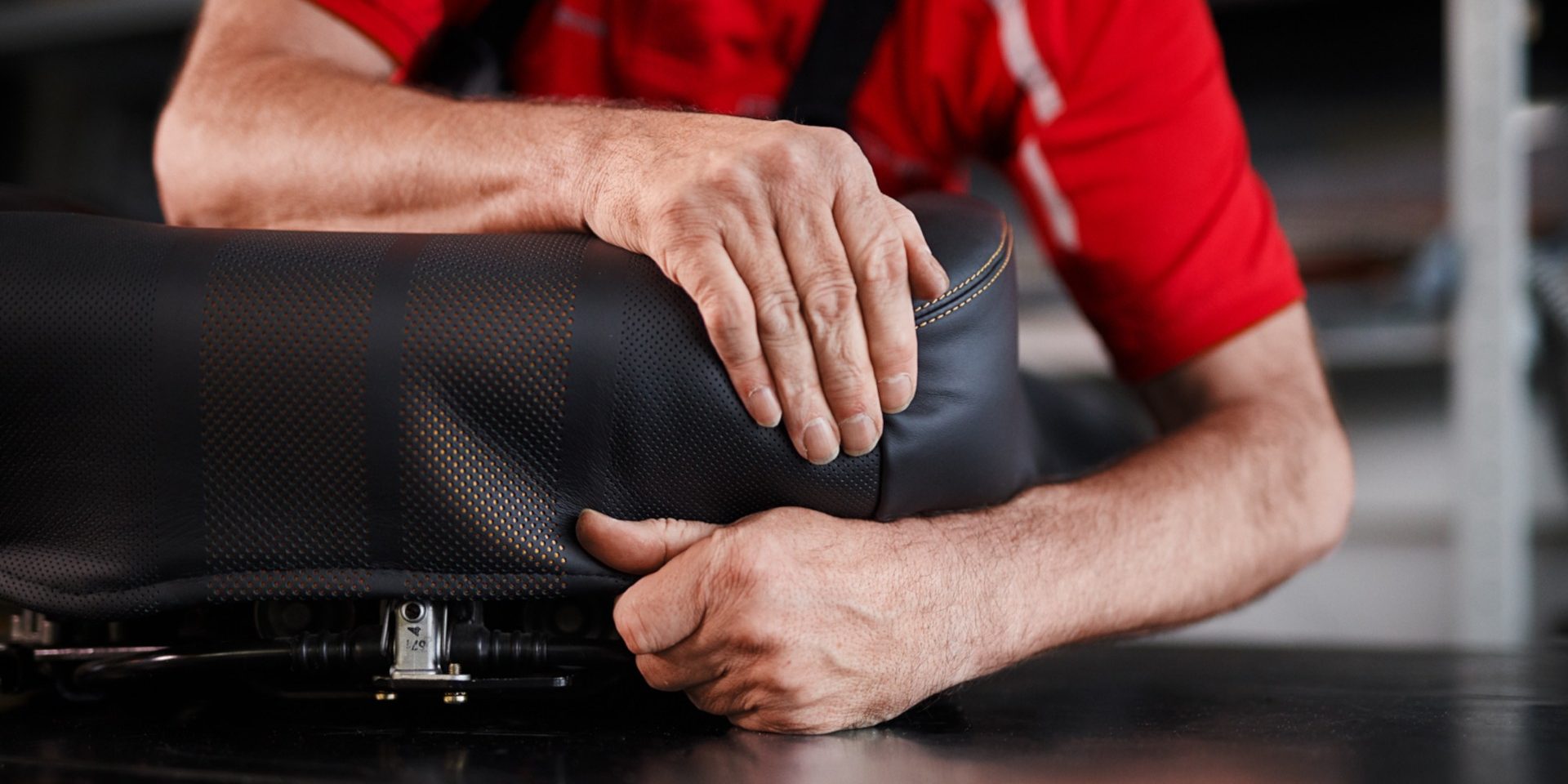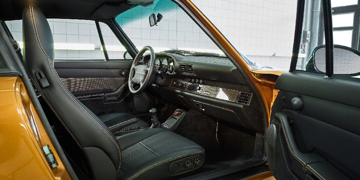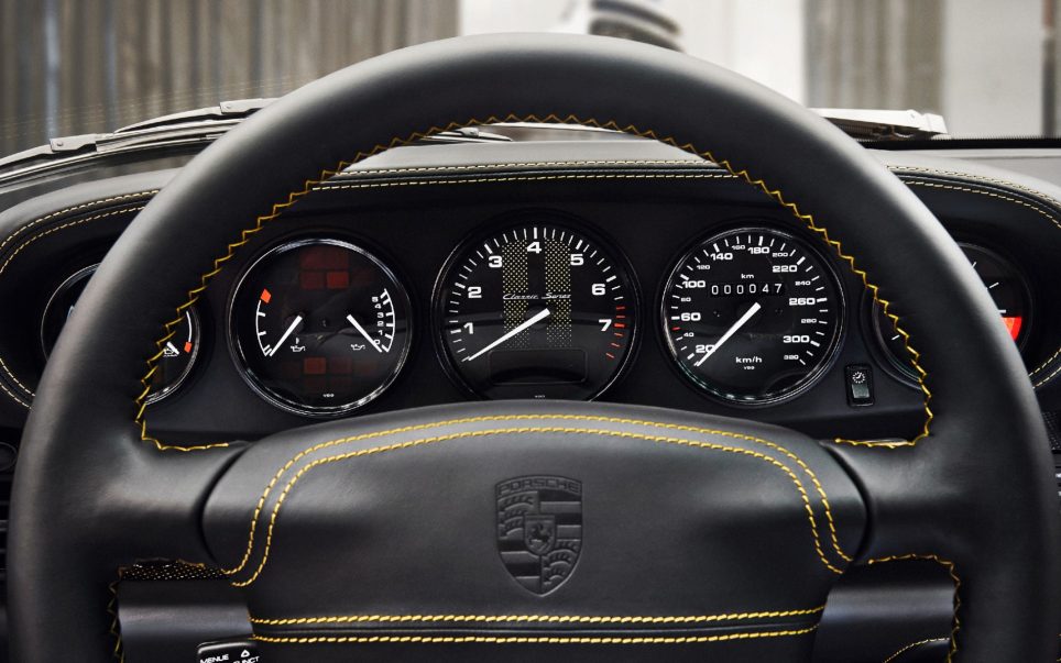 O interior deste 993 Turbo está feito em preto e amarelo (pespontos nos bancos, tablier e volante) e conta, também, com elementos novos iguais aos da época vendidos, também, no catalogo da Porsche Classic.