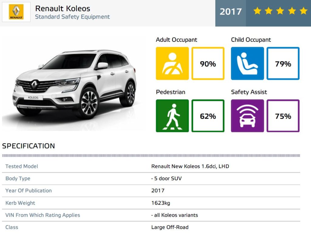 O compromisso da Renault para com a segurança dos seus modelos fica comprovado com o resultado obtido nos rigorosos testes de segurança levados a cabo pelo Euro NCAP (European New Car Assessment Programme – programa de segurança automóvel independente e suportado pela União Europeia) em 2016. O Novo Koleos obteve notas de 90% na “Proteção de Adultos”, 79% na “Proteção de Crianças”, 62% na “Proteção de Peões” e 75% nos diferentes “Equipamentos de segurança”.