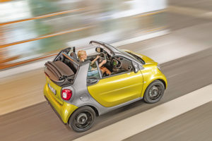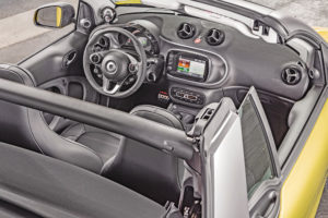 Desenvolvido em parceria com a Renault, mas sob a alçada de sempre da Mercedes, o cabrio mantém todas as qualidades que já apreciávamos no fortwo, acrescentando-lhe a versatilidade extra de poder ser transformado em poucos segundos num belo descapotável, com todas as vantagens que isso acarreta. Tal como no modelo que agora substitui, o segredo está na capota de lona elétrica, bem mais acessível e leve do que um teto rígido, e cujo rebatimento e recolha é concretizado em cerca de 12 segundos. Tem ainda outro ponto a favor, que no fundo diz respeito aos três modos em que pode ser utilizada: ao pressionar-se o botão num primeiro instante, o sistema funciona como uma espécie de teto de abrir elétrico, recolhendo até à extremidade do pilar C – no nosso entender a melhor opção por ser a que mais favorece a visibilidade traseira. Insistindo no processo do botãozinho, a capota recua mais um pouco até assentar no portão traseiro. Por fim, há ainda a possibilidade de retirar os dois apoios do sistema, que no fundo suportam o tejadilho entre o pilar B e C, e guardá-los num compartimento específico da bagageira, transformando o fortwo cabrio num… roadster! Mais modular do que isto, impossível…