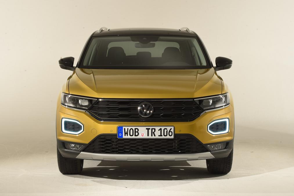 A frente do T-Roc é caracterizada pelo logótipo VW bem visível, uma larga grelha, faróis esguios e umas arredondadas luzes diurnas LED.