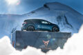 Cupra Born a voar por entre os Alpes suíços, pendurado num helicóptero